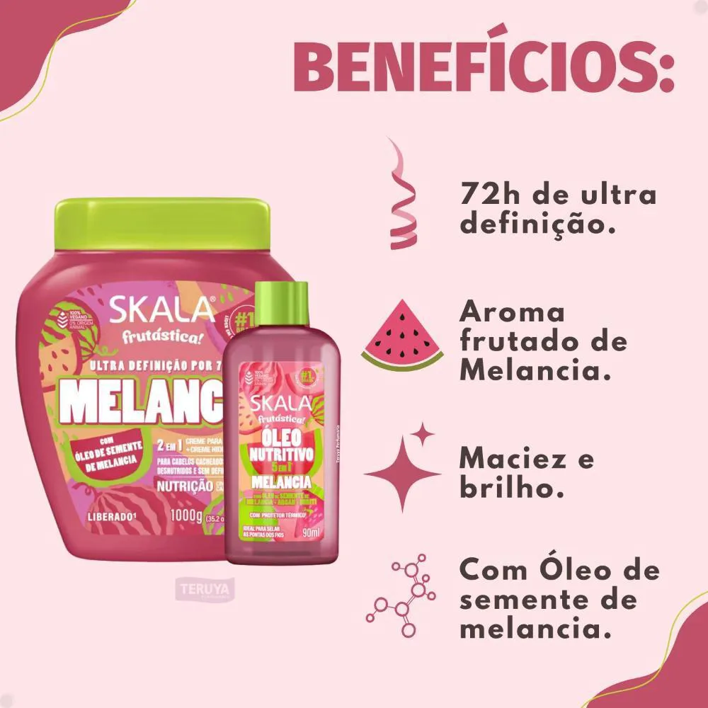 Descubra o poder da natureza com o Kit Skala Frutastica Melancia, a solução ideal para uma rotina de nutrição e hidratação capilar profunda. Desenvolvido para atender às necessidades de cabelos cacheados e crespos, este kit proporciona maciez, brilho intenso e fortalecimento, garantindo ultra definição por 72 horas. Com a fragrância vibrante da melancia, seus cabelos receberão o cuidado que merecem, transformando-os em fios saudáveis e cheios de vida.Benefícios Principais
