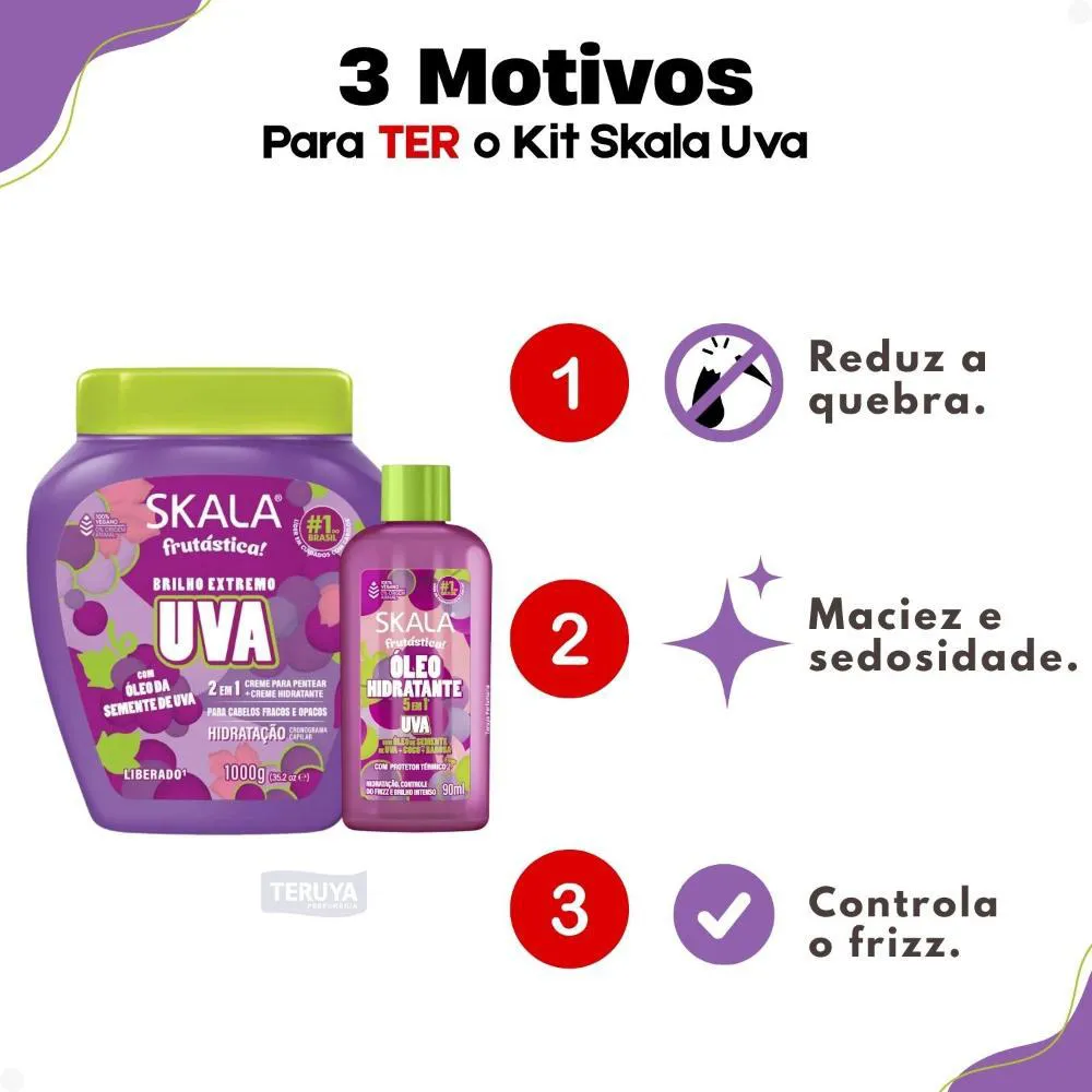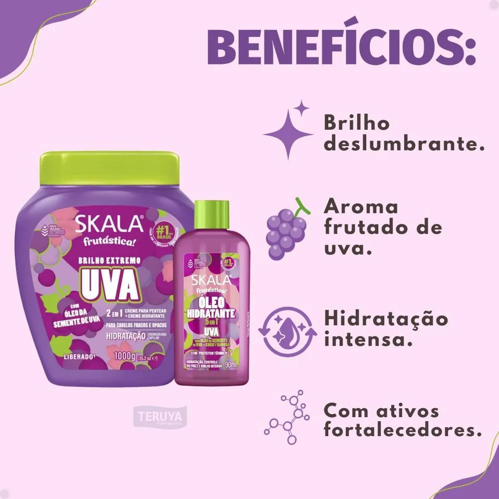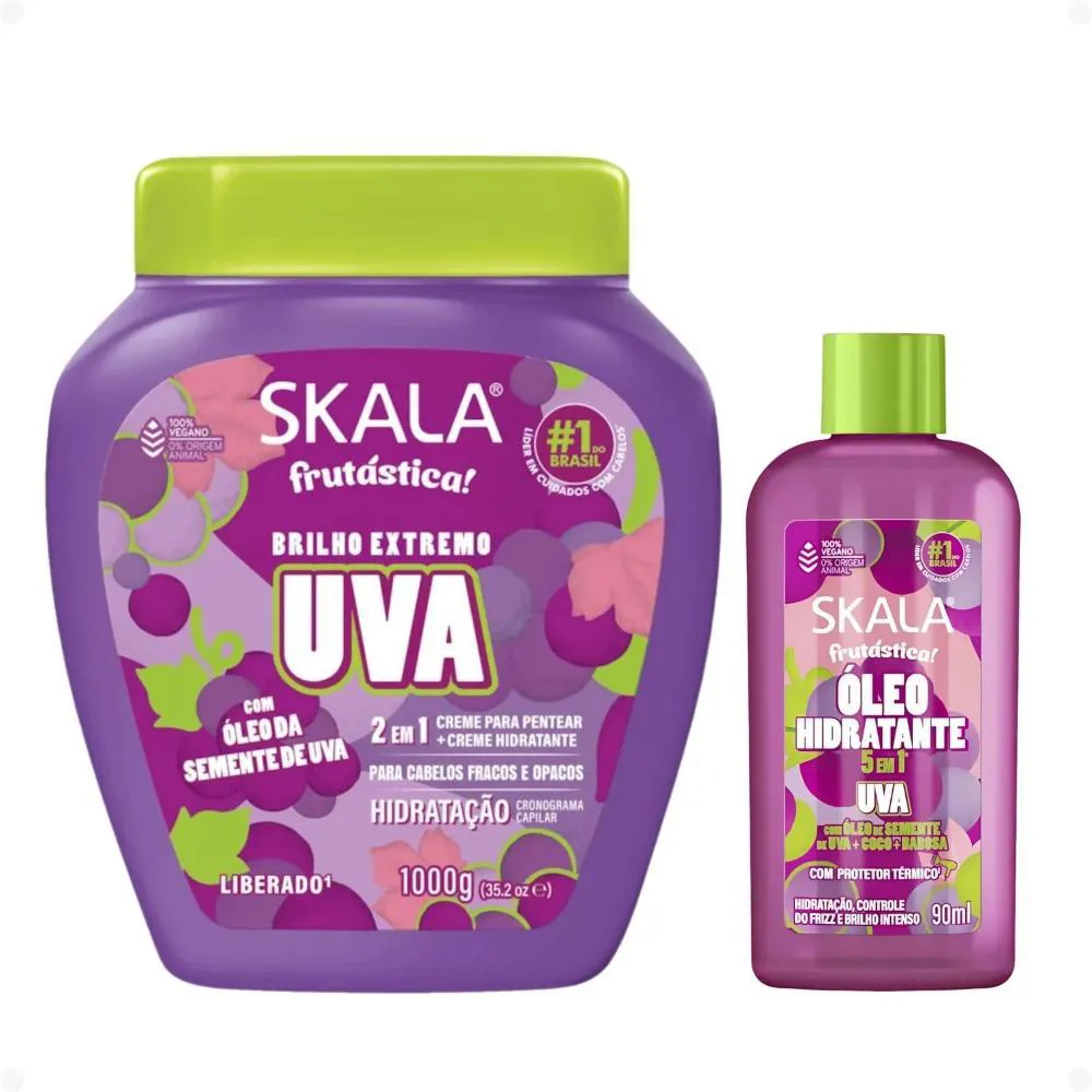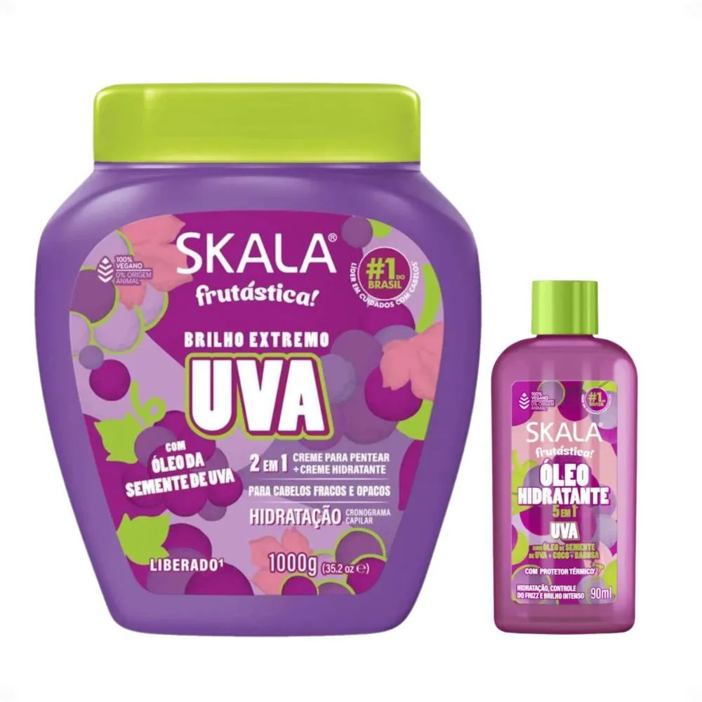 Marca: SKALAProduto: Kit Skala Frutástica Uva: Creme Tratamento 1000g e Óleo Hidratante 90mlPeso do Kit: 1.25 kgConteúdo do Creme de Tratamento: 1000gConteúdo do Óleo Hidratante: 90mlFragrância: UvaTipo de