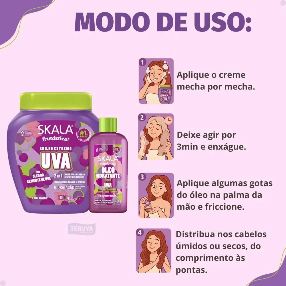 Para o Creme de Tratamento 2 em 1 Uva: pode ser utilizado como creme de tratamento (após o
