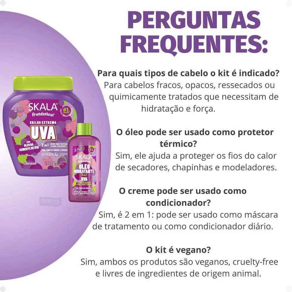 O Kit Skala Frutástica Uva se destaca por sua formulação inovadora e compromisso com a saúde capilar:Formulação vegana, ideal para quem busca produtos livres de ingredientes de origem animal.Produto cruelty-free, não testado em animais.Livre de parabenos, silicones e petrolatos, garantindo um tratamento mais natural.Enriquecido com Óleo de Semente de Uva, rico em