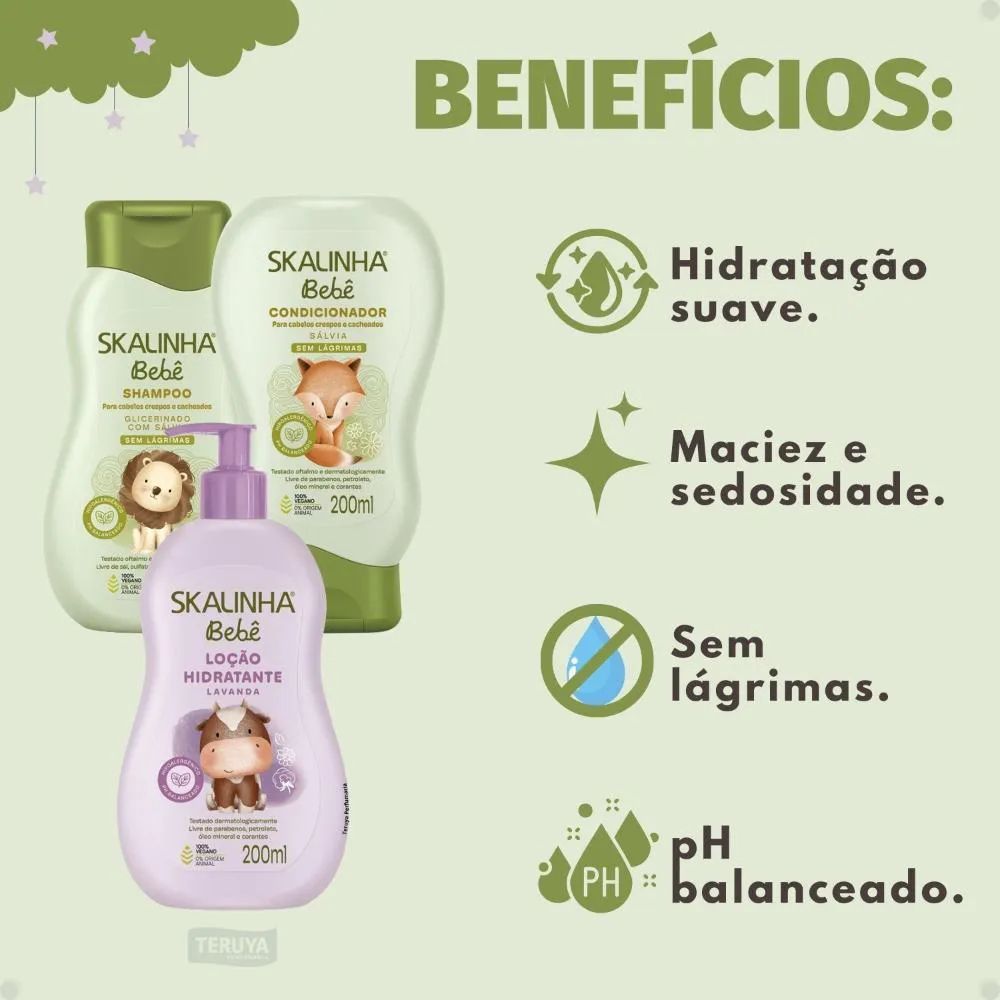 Kit Skalinha Bebê para Cabelos Crespos e Cacheados: Shampoo e Condicionador 200Ml + Loção Hidratante Lavanda 200Ml