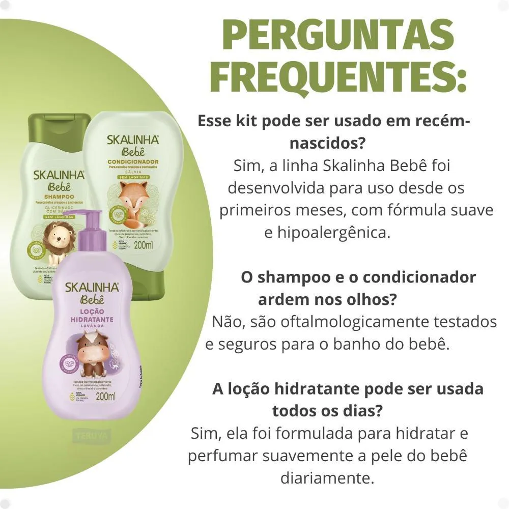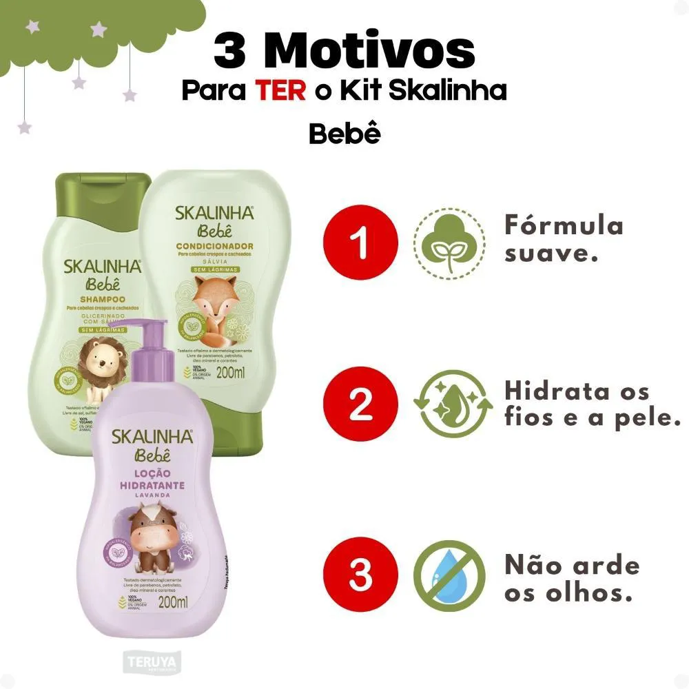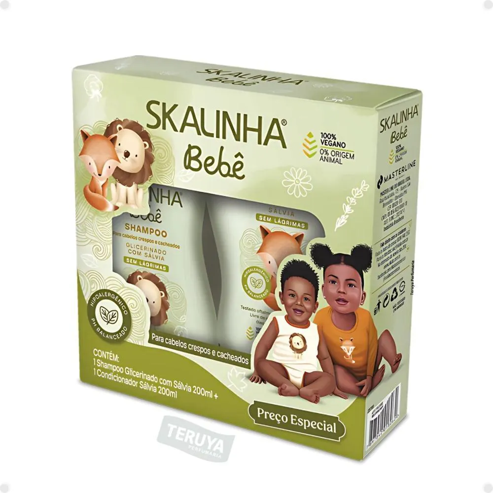Marca SKALA, reconhecida pela excelência e qualidade em produtos capilares.Linha Skalinha Bebê, formulada para a sensibilidade e segurança da pele e cabelos infantis.Kit completo que inclui Shampoo, Condicionador e Loção Hidratante, oferecendo uma rotina de cuidados integrada.Produto específico para cabelos crespos e cacheados, atendendo a uma demanda particular com expertise.Ocasiões de Uso/Cenários Ideais