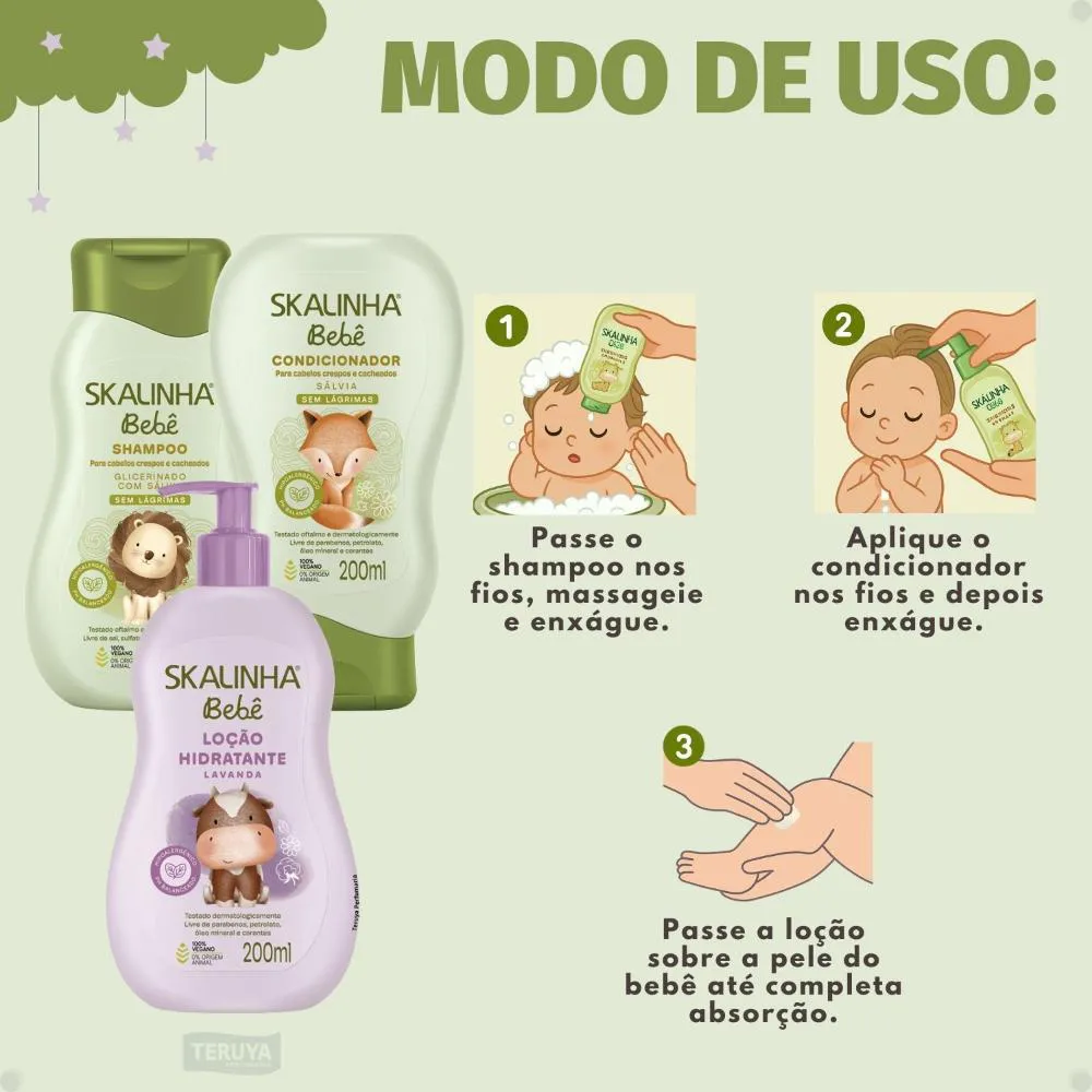 Shampoo: Aplique uma pequena quantidade nos cabelos molhados do bebê, massageie suavemente o couro cabeludo e os fios, e enxágue abundantemente.Condicionador: Após lavar com o shampoo, aplique o condicionador nos cabelos úmidos, distribuindo uniformemente. Deixe agir por alguns minutos e enxágue bem.Loção Hidratante: Aplique a loção sobre a pele limpa e seca do bebê, massageando suavemente até completa absorção. Ideal para usar após o banho.Anvisa Condicionador: 25351.500621/2023-34 Anvisa Loção Hidratante: 25351.337466/2021-41
