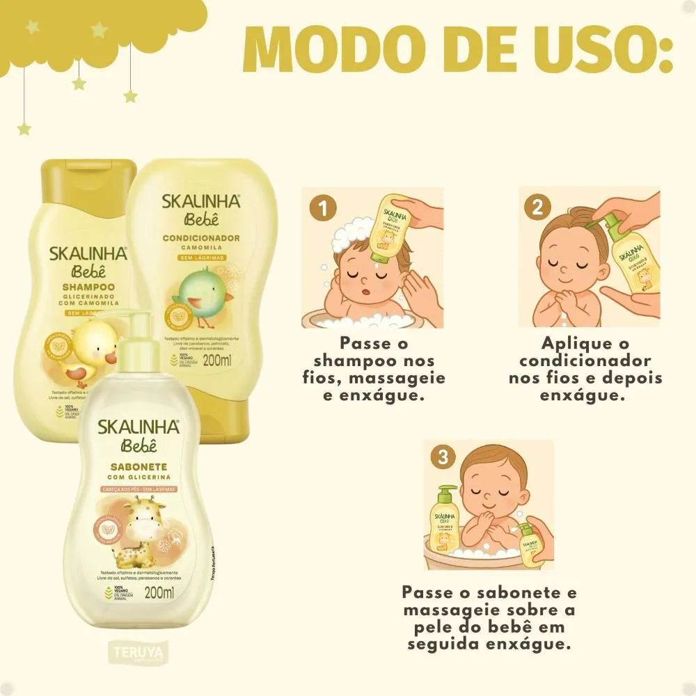 Shampoo Camomila: Aplique uma pequena quantidade nos cabelos molhados do bebê, massageie suavemente até formar espuma e enxágue abundantemente. Evite o contato com os olhos. Caso ocorra, enxágue com água corrente.Condicionador Camomila: Após lavar os cabelos com o shampoo, aplique o condicionador nos fios molhados, massageie e enxágue bem. Deixe agir por alguns instantes para melhor hidratação.Sabonete Líquido com Glicerina: Aplique uma pequena quantidade na mão ou em uma esponja macia, espalhe sobre o corpo molhado do bebê, massageie suavemente e enxágue completamente. Ideal para uso diário.Anvisa Condicionador: 25351.337527/2021-71 Anvisa Sabonete Líquido: 25351.30934/2022-23