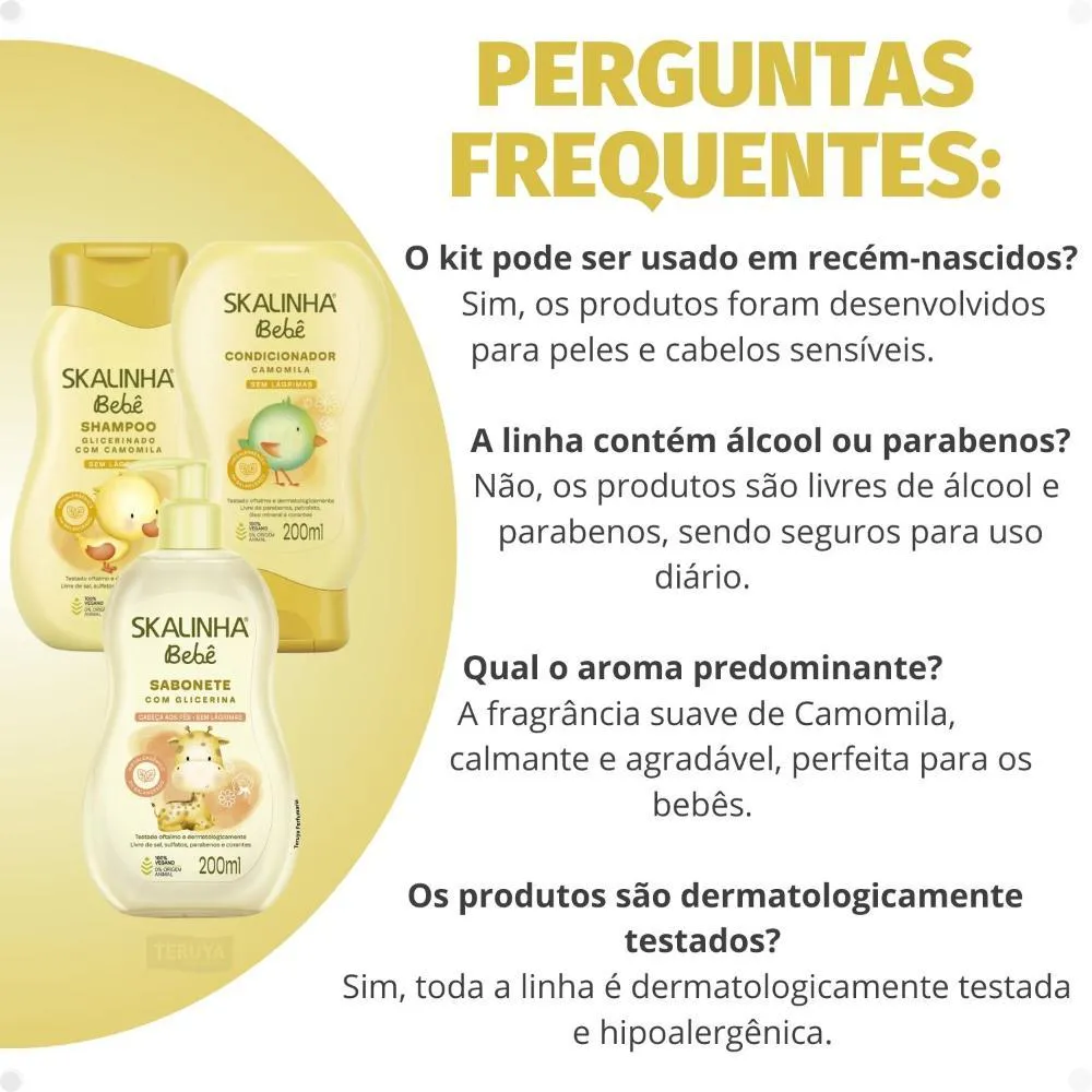 Linha Skalinha Bebê, desenvolvida especificamente para a pele e cabelos delicados de bebês, garantindo segurança e eficácia.Combinação de Shampoo, Condicionador e Sabonete Líquido em um kit prático, oferecendo uma solução completa para a higiene do bebê.Fórmulas enriquecidas com ingredientes conhecidos por suas propriedades suaves, como camomila e glicerina, minimizando o risco de alergias e irritações.Marca SKALA, reconhecida pela qualidade e cuidado em seus produtos, transmitindo confiança aos pais.Testado dermatologicamente, garantindo a segurança e o bem-estar do bebê.Ocasiões de Uso/Cenários Ideais