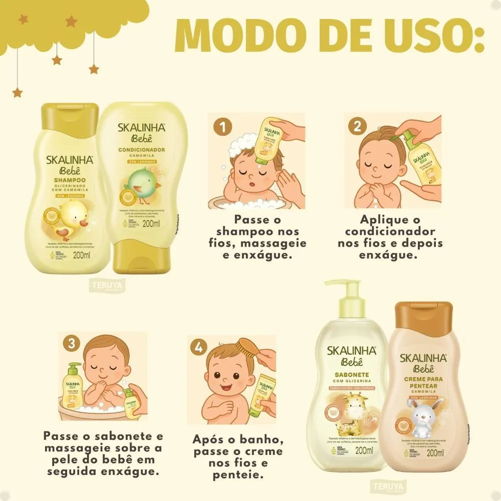 Shampoo: Aplique nos cabelos molhados, massageie suavemente e enxágue bem.Condicionador: Após o shampoo, aplique nos cabelos molhados, deixe agir por alguns minutos e enxágue.Sabonete Líquido: Aplique na pele molhada do bebê, massageie suavemente e enxágue.Creme Para Pentear: Com os cabelos úmidos ou secos, aplique uma pequena quantidade nas mãos e distribua pelos fios, penteando como de costume.Anvisa Shampoo: 25351.309416/2022-55