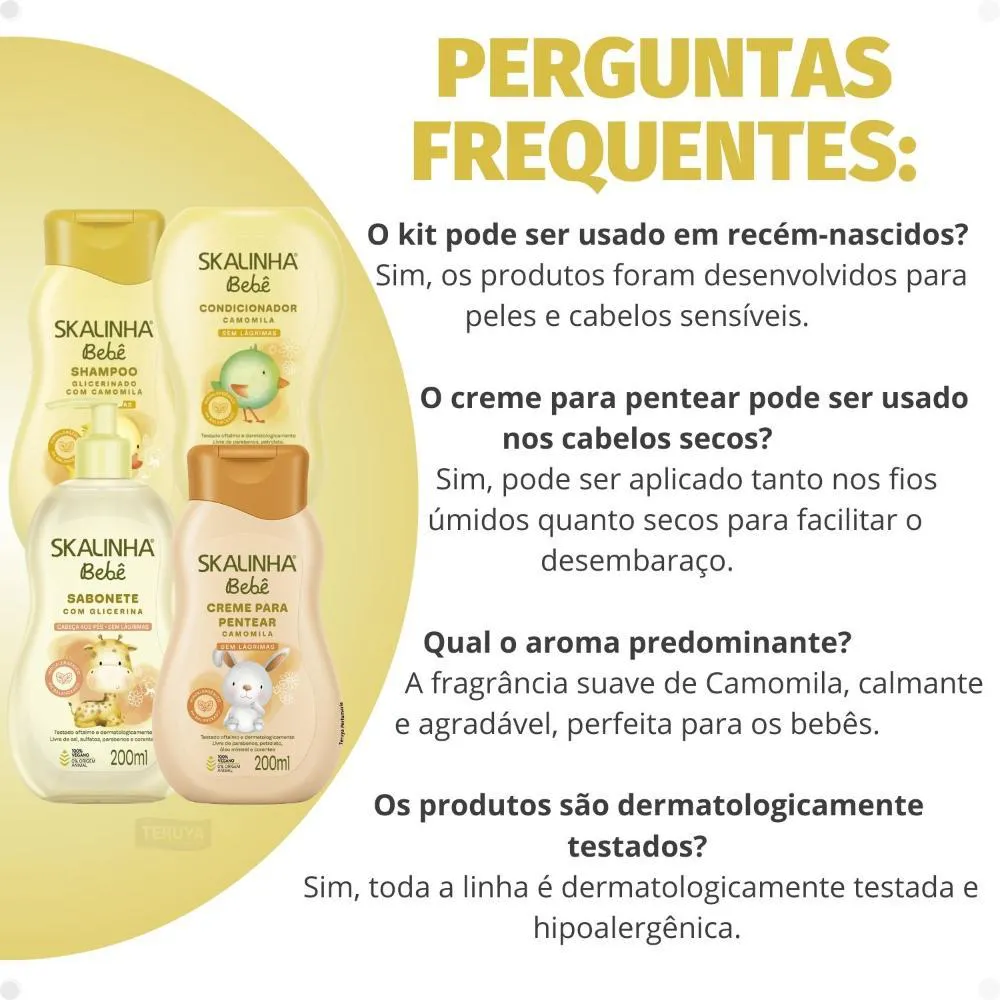 Fórmula enriquecida com extrato de Camomila, conhecida por suas propriedades calmantes e suavizantes.Desenvolvido especificamente para a pele e cabelos sensíveis dos bebês, minimizando riscos de irritação.Kit completo que oferece uma rotina de cuidados integrada: Shampoo, Condicionador, Sabonete Líquido e Creme Para Pentear.Ocasiões de Uso/Cenários Ideais