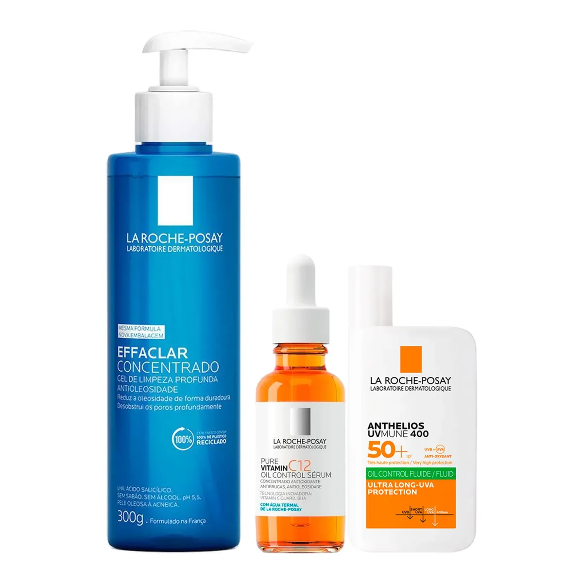 Kit Solar Facial La Roche-Posay Gel de Limpeza Effaclar para Pele Oleosa 300g + Sérum Anti-Rugas Pure Vitamin C12 Oil Control 30ml + Protetor Anthelios UVMune 400 Airlcium Antioleosidade FPS 60 40ml