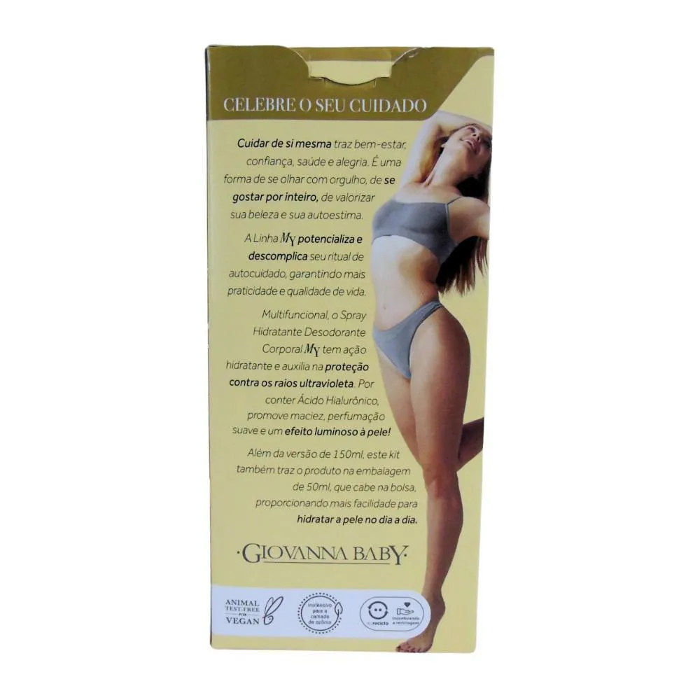 A linha My potencializa e descomplica seu ritual de autocuidado, garantindo mais praticidade e qualidade de vida. Multifuncional, o Spray Hidratante Desodorante Corporal My tem ação hidratante e auxilia na proteção contra os raios ultravioleta. Por conter Ácido Hialurônico, promove maciez, perfumação suave e um efeito luminoso a pele. Além da versão de 150ml, este kit também traz o produto na embalagem de 50ml, que cabe na bolsa, proporcionando mais facilidade para hidratar a pele no dia a dia. Modo de Usar Agite bem antes de usar. Aplique em todo o corpo sempre que desejar, a uma distância de 15cm da pele. ESTE PRODUTO NÃO É UM protetor solar. Precauções Cuidado, recipiente sob pressão. Inflamável. Não pulverizar perto do fogo. Não perfurar nem incinerar. Não expor ao sol nem a temperaturas superiores a 50°C. Proteger os olhos durante a aplicação. Mnater fora do alcance de crianças. Usar somente nas áreas indicadas. Não usar se a pele estiver irritada ou lesionada. Caso ocorra irritação e/ou prurido no local da aplicação, suspender o uso imediatamente. Evitar a inalação direta deste produto. Uso adulto. Testado dermatologicamente. Composição Butano; propano; isobutano; água; ácido fenilbenzimidazol sulfônico; octinoxato; álcool etílico; isopropanolamina; glicerol; óleo de rícino hidrogenado peg-40; 2-metil 5-cicloexilpentanol; hidroxiacetofenona; ácido hialurônico; corante branco 77891; fluorflogopita sintética; sorbato de potássio; benzoato de sódio; corante vermelho 77491.