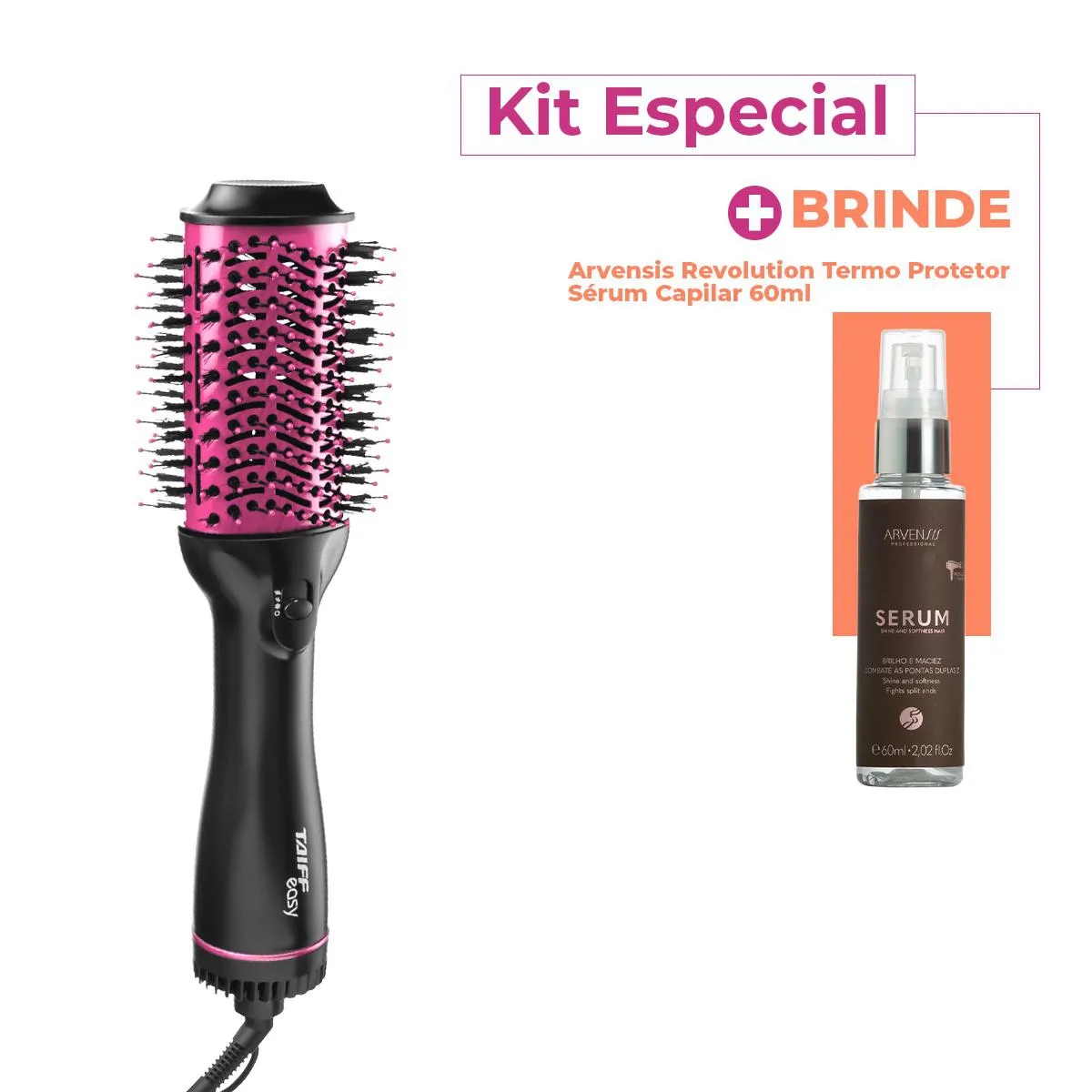 Este Kit Contém Taiff Easy 1200W 127V Rosa - Escova Secadora: seca, alisa e modela em um só movimento. Compacta e leve, traz 2 temperaturas e cabo giratório que facilitam o uso no dia a dia. Brinde Arvensis Revolution Termo Protetor - Sérum Capilar 60ml: conta com proteção térmica, brilho imediato e vitamina e, trata enquanto protege do calor, deixando os fios sedosos, reparados e radiantes.Características: