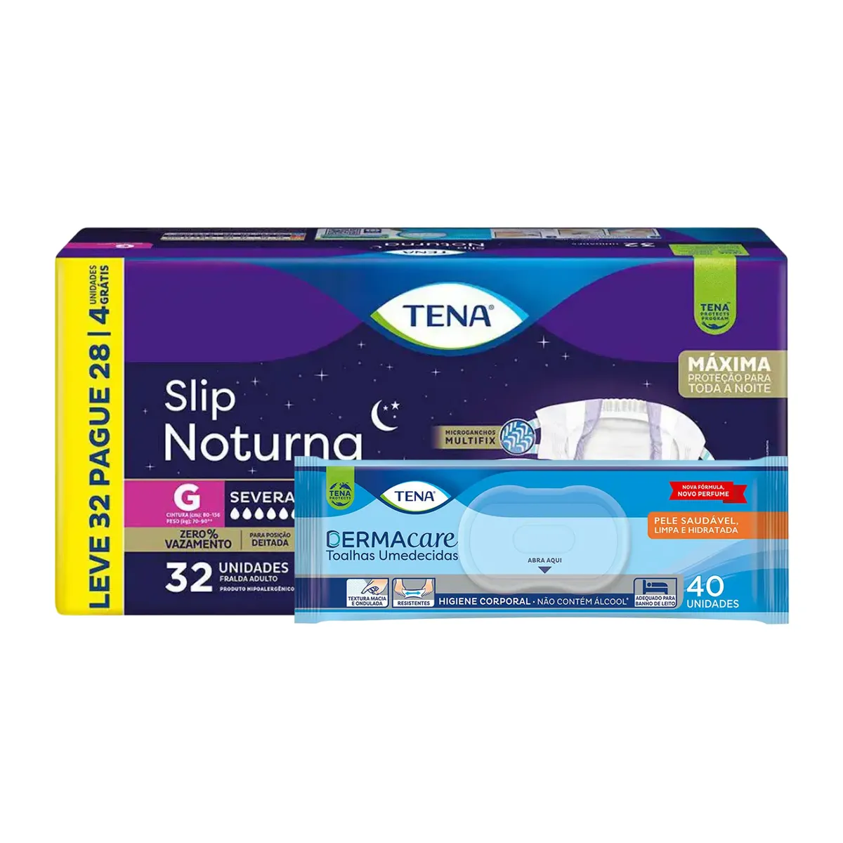 Kit Tena Fralda Geriátrica Slip Noturna G 32 Unidades + Toalha Umedecida Dermacare Adulto 40 unidades