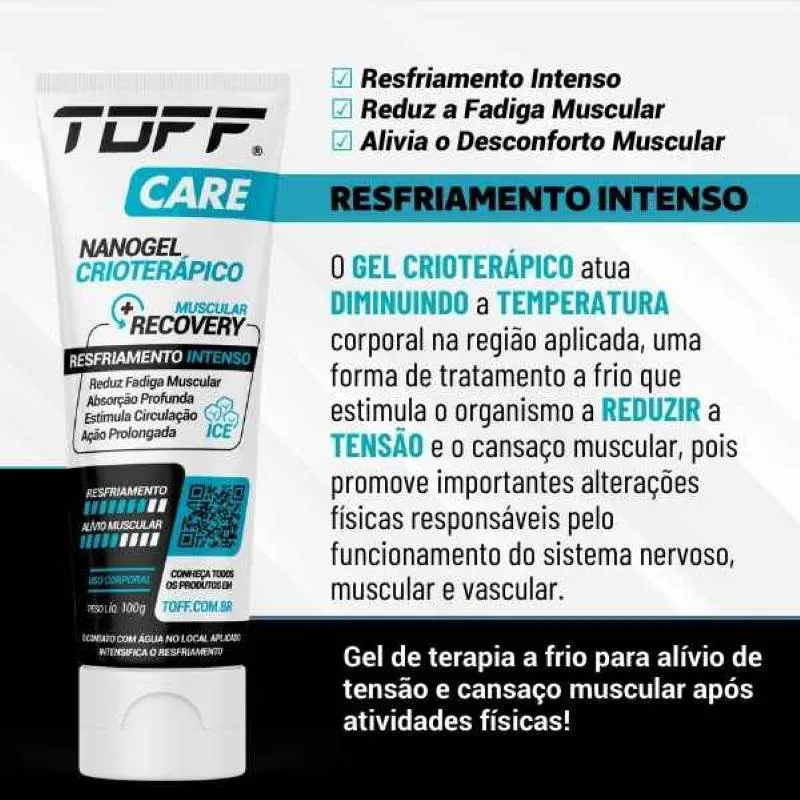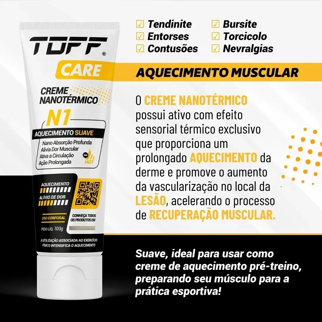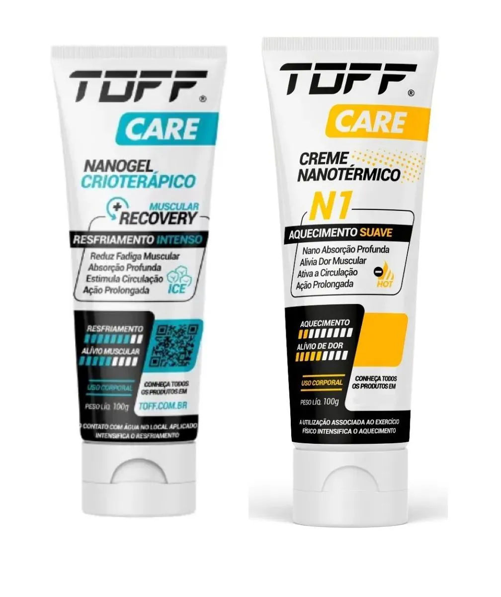 Kit Toff Care N1 100g Aquecimento para Alívio Das Dores + Kit Toff Gel Crioterápico 100g Resfriamento Intenso Alívio Das Dores TOFF CARE NANOTÉRMICO N1 100GR O TOFF CARE NANOTÉRMICO N1 é um creme terapêutico desenvolvido com nanotecnologia cosmética que facilita a absorção profunda dos nanoativos funcionais responsáveis por aliviar a dor muscular. A formula também possui ativos térmicos com efeito sensorial exclusivo que proporcionam um prolongado aquecimento da derme e promovem o aumento da vascularização no local da lesão, acelerando o processo de recuperação muscular.