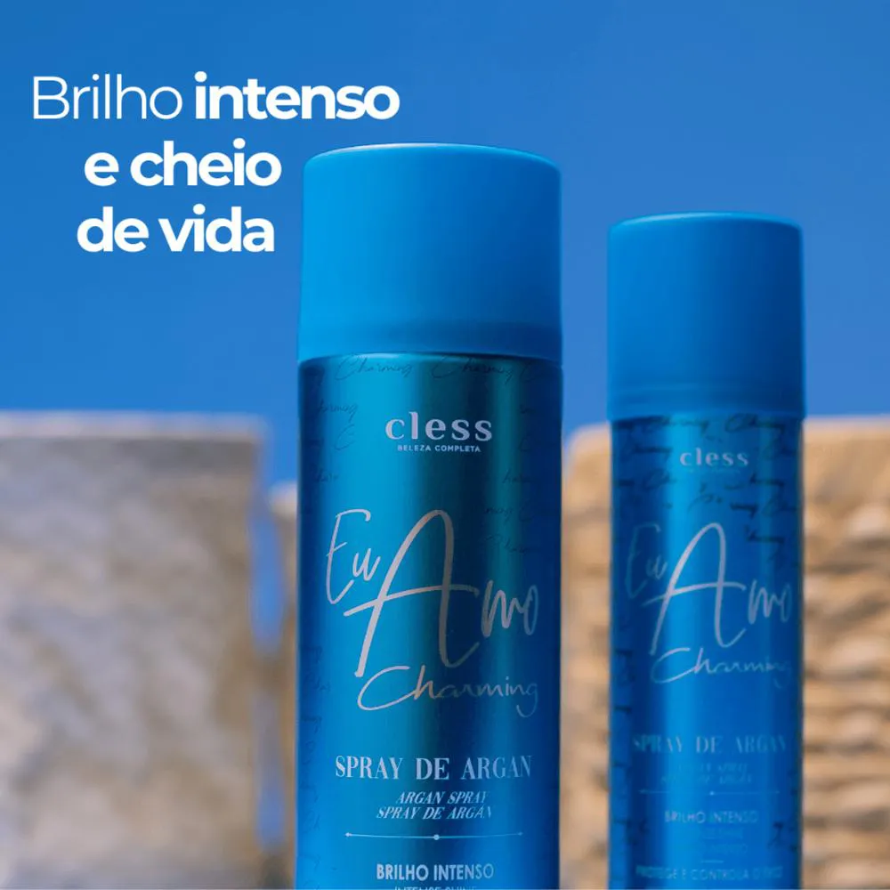 Perfeito para todos os tipos de cabelo, o kit proporciona fios restaurados, macios, alinhados e com um brilho intenso desde a primeira aplicação. O Spray de Brilho Argan eu Amo Charming, auxilia o reparo dos fios , reduz o frizz e dá brilho . Sua fórmula com Óleo de Argan oferece nutrição e ajuda a restaurar o cabelo seco e quebradiço. O Spray Argan atua como protetor térmico que preserva os fios do calor do secador e da chapinha/prancha. O Argan é rico em vitamina e e ácidos graxos essenciais. Pode ser usado qualquer momento do dia para realçar o brilho e finalizar o penteado.