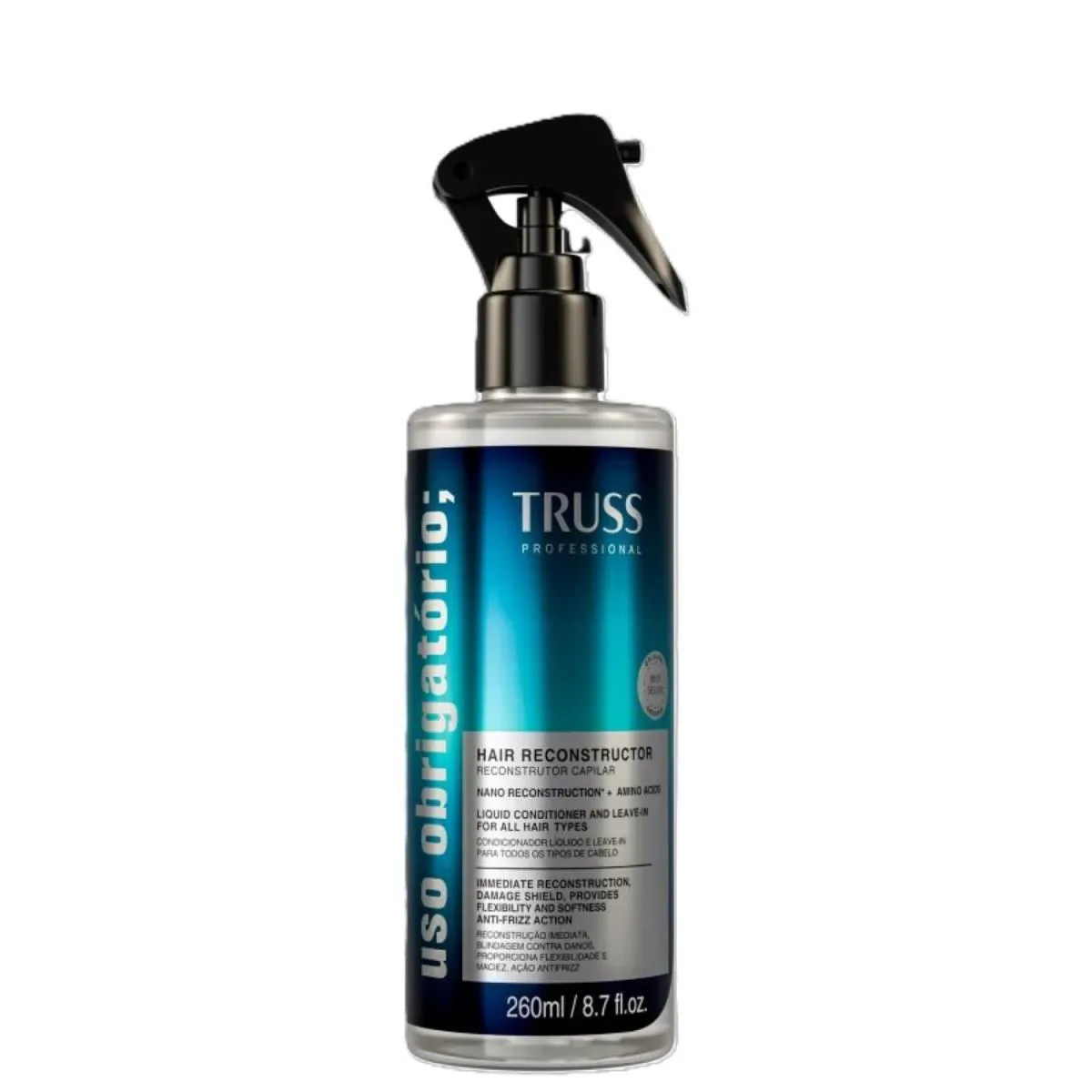 Tratamento líquido para cabelos quebradiços, desidratados e com química. O Kit TRUSS Amino Uso Obrigatório Reconstructor (2 Produtos) um tratamento de reconstrução com e sem enxágue, que pode ser usado como máscara, protetor térmico ou finalizador, para blindagem contra danos e ação condicionante. Ambos produtos trazem fórmula com ingredientes poderosos, como os Nano Reconstruction e o Aminoácidos, que penetram profundamente na fibra capilar e promovem reconstrução imediata, para mais brilho, maciez e combate de frizz. A tecnologia TRUSS Reconstrução vai te surpreender com resultados de alta performance, seu cabelo ficará deslumbrante. Experimente agora o Uso Obrigatório TRUSS! Contém: - TRUSS Líquido Reconstrutor 260ml; - TRUSS Amino Liponutriente 30ml. Características do Tratamento Líquido TRUSS Uso Obrigatório: - Reconstrução imediata da fibra capilar; - Promove mais brilho; - Proporciona maciez; - Combate o frizz; - Oferece blindagem contra danos e ação condicionante. Características do Tratamento Líquido TRUSS Amino Liponutriente 30ml: O Protetor térmico TRUSS Amino Liponutriente, além de proteger os cabelos do secador e da prancha, ainda potencializa a hidratação. Sela os fios proporcionando brilho intenso com efeito gloss e facilidade ao desembaraçar. Durante a escova, ou uso da prancha, Amino melhora o deslizamento e reduz o tempo de secagem. Nenhum produto TRUSS é testado em animais, ou seja, este produto possui o selo Cruelty Free. *A nova fórmula do Uso Obrigatório TRUSS consiste na mudança de fragrância de evolução premium, com notas frutais leves e sofisticada, assinada por uma das maiores Casas de Fragrâncias do mundo, a Givaudan. **O produto herói mantém a fórmula de alta performance, com destaque para sua potência de 87% menos quebra para todos os tipos de cabelos danificados.