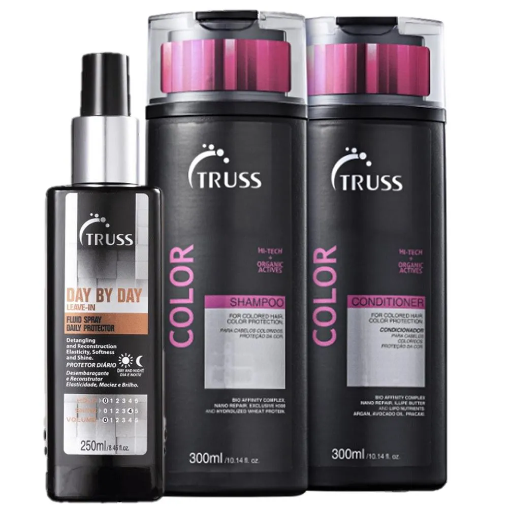 Color da Truss oferece todos os cuidados essenciais para cabelos coloridos. Recupera e repara os danos causados pela coloração enquanto protege a cor, evita o desbotamento e confere brilho. Este Kit Contém Truss Color - shampoo 300ml: limpa, prolonga o brilho e previne o desbotamento e alteração da cor.Truss Color Conditioner - condicionador 300ml: desembaraça, promove brilho intenso e evita o desbotamento e alteração da cor. Truss Blond Day By Day - Leave-in 250ml: protege os fios, facilita a escovação e reestrutura a fibra capilar. Como Usar Conselho de Aplicação Shampoo: Aplique o shampoo no cabelo molhado e massageie de forma suave até formar espuma. Enxágue e, caso necessário, lave os fios mais uma vez. Condicionador: Retire o excesso de água dos fios e distribua o condicionador no comprimento e pontas. Massageie, desembarace, deixe agir por 2 minutos e enxágue. Leave-in: Aplique uma pequena quantidade do finalizador na palma das mãos e distribua sobre comprimento e pontas dos cabelos úmidos. Depois, seque seus fios com o auxílio do secador e modele da forma que desejar.