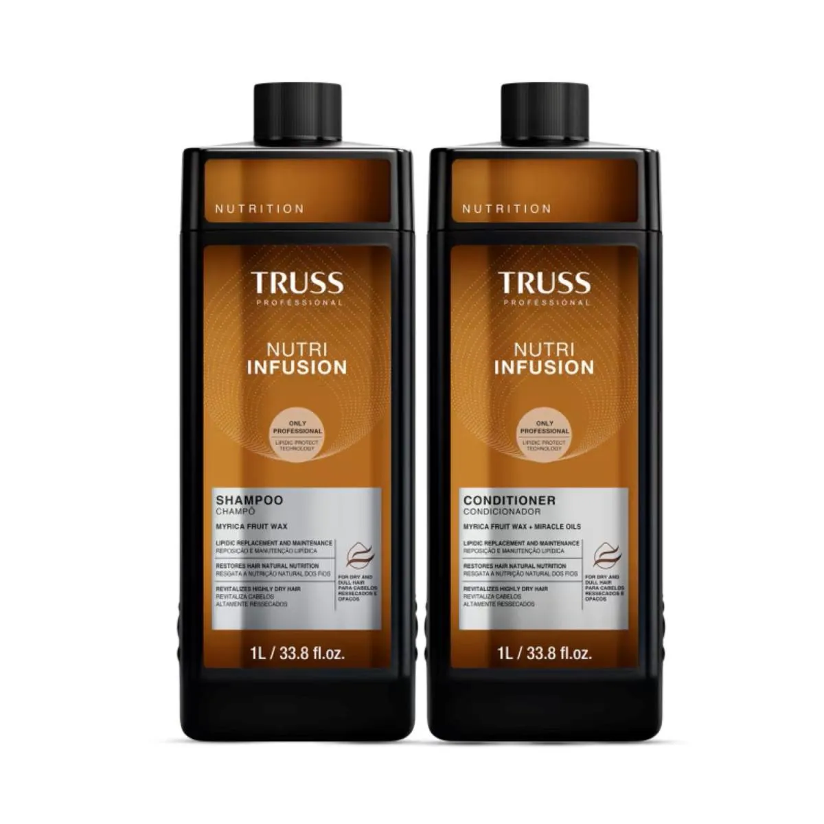 Nenhum produto TRUSS é testado em animais, ou seja, este item possui selo Cruelty Free. Contém: Truss Nutri Infusion - Shampoo 1L: é capaz de limpar, enquanto nutre as camadas mais profundas e necessitadas da fibra, resgatando a nutrição natural dos fios e revitalizando os cabelos altamente ressecados. Truss Nutri Infusion - Condicionador 1L: penetra nas camadas mais profundas da fibra capilar, retendo os lipídios essenciais e criando uma barreira contra a perda de hidratação, para um
