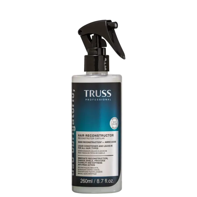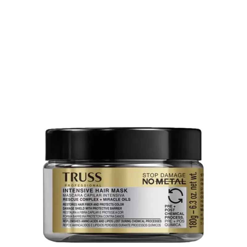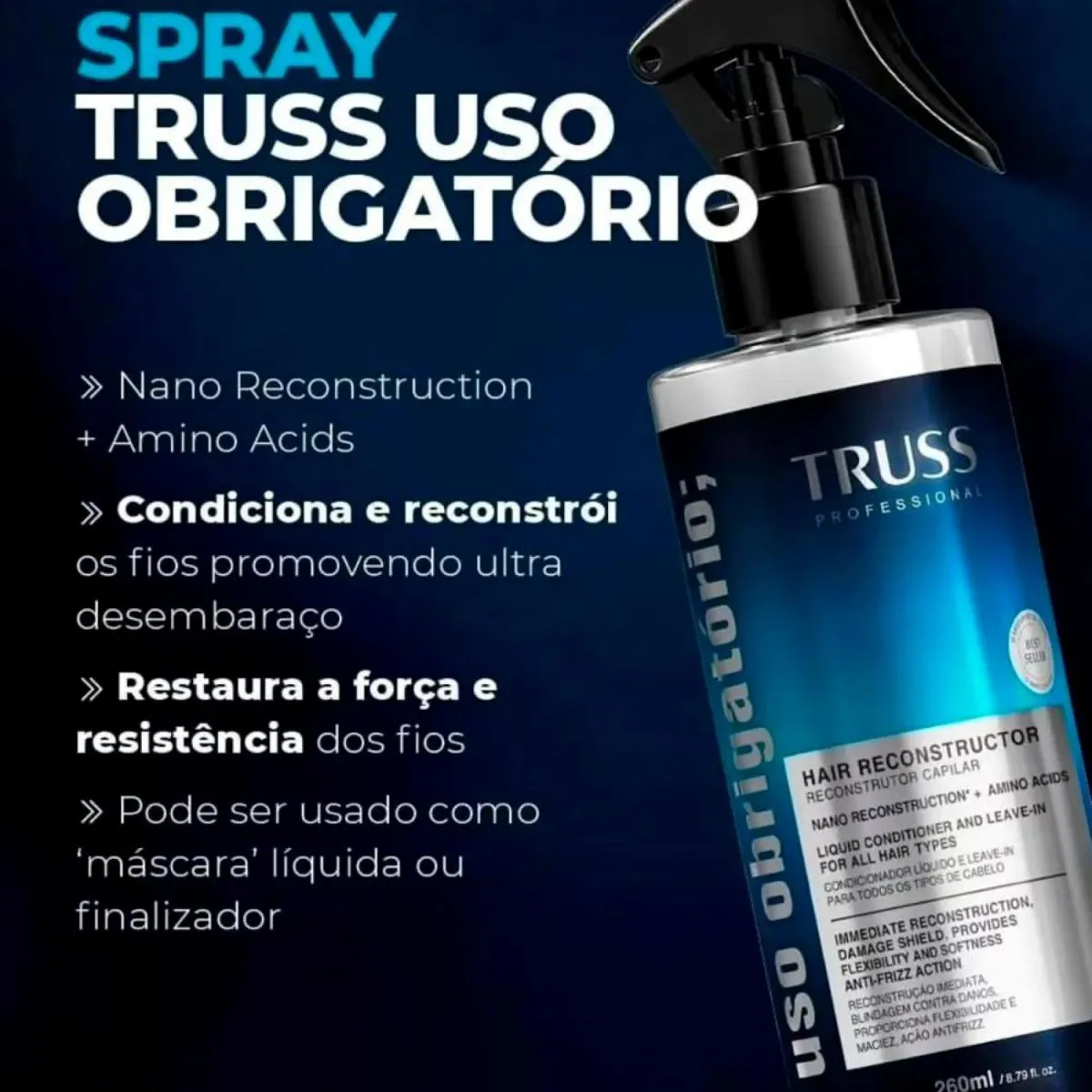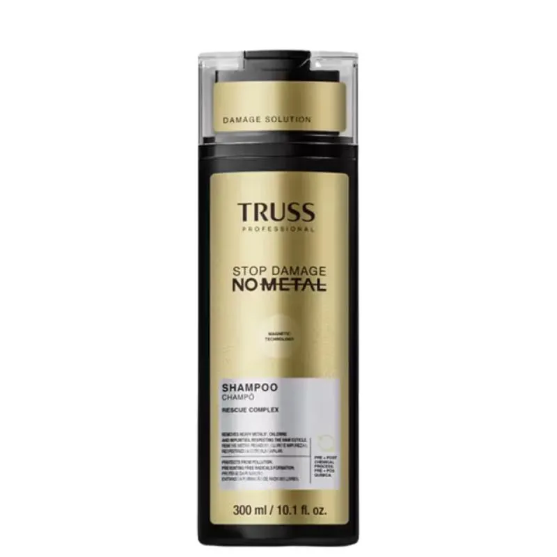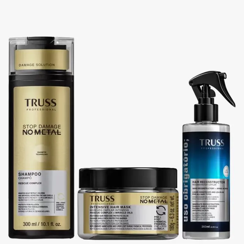 Kit conta com uma rotina completa de reconstrução e blindagem para cabelos danificados e ressecados. Ele combina o tratamento descalcificante da linha No Metal (shampoo e máscara) com o poder reconstrutor e protetor do Spray Uso Obrigatório. Juntos, os produtos promovem limpeza profunda, remoção de metais pesados, hidratação intensa e proteção contra danos térmicos e externos, garantindo a reconstrução imediata da fibra capilar e até 87% menos quebra. Contém: SHAMPOO STOP DAMAGE NO METAL - 300ml Este shampoo é o cuidado essencial para cabelos danificados e que passaram por processos químicos, sendo ideal para uso pré e pós-química. Sua Tecnologia com Ação Molecular Magnética atrai e captura metais pesados, cálcio e impurezas presentes nos fios. Ele possui ação descalcificante e é enriquecido com o Rescue Complex, formando uma barreira protetora que sela o tratamento. MÁSCARA CAPILAR NO METAL - 180g A máscara oferece restauração capilar profunda para cabelos danificados, agindo no pré e pós-química. Seu Blend de Miracle Oils e Rescue Complex repõe lipídeos e aminoácidos proteicos, aumentando a elasticidade e resistência dos fios. O produto suaviza o cabelo, proporciona uma aparência saudável e com brilho, além de reduzir o frizz. SPRAY USO OBRIGATÓRIO - 260ml Este spray reconstrutor, um dos queridinhos da TRUSS, agora possui uma fragrância floral Frutal ainda mais sofisticada e duradoura. Sua fórmula com Nano Reconstruction e Aminoácidos entrega blindagem contra danos, flexibilidade e maciez. Pode ser usado após o shampoo e antes da máscara ou condicionador para um efeito condicionante. Nenhum produto TRUSS é testado em animais, ou seja, este item possui selo Cruelty Free.