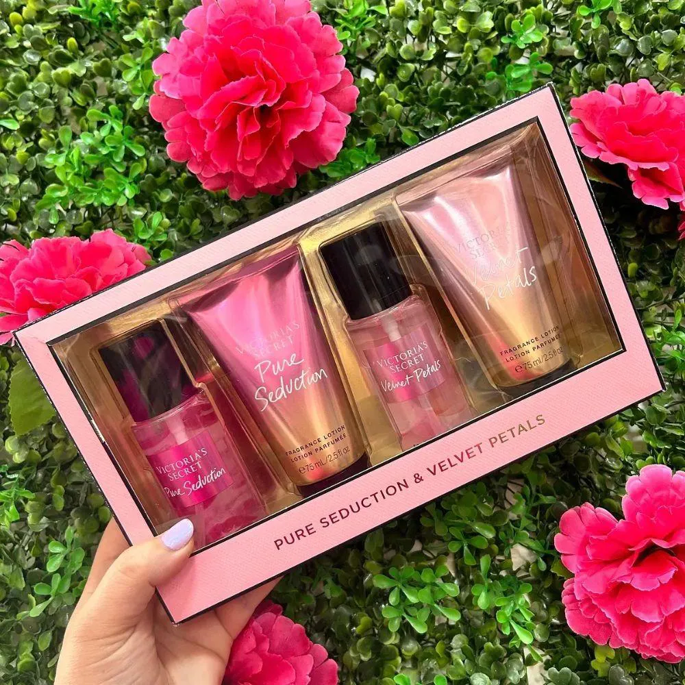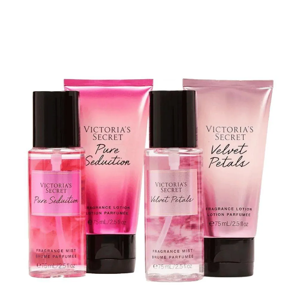 O kit é composto por dois body splashes e duas loções corporais com fragrâncias distintas (Pure Seduction e Velvet Petals), desenvolvidos para perfumar e hidratar o corpo com fragrâncias suaves e sedutoras.