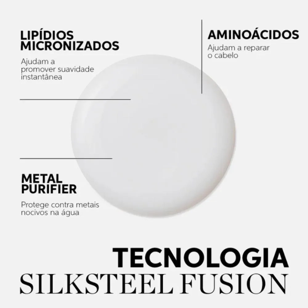 O shampoo Fusion Repair é um produto de limpeza restauradora que remove impurezas, utilizando a tecnologia Silksteel Fusion com aminoácidos e lipídios micronizados para reforçar a estrutura capilar e melhorar a elasticidade dos fios.