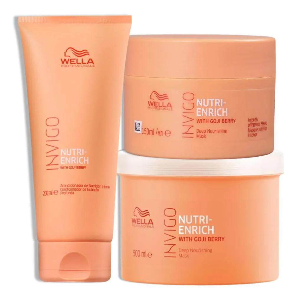 O Kit Wella Nutri Enrich entrega um tratamento nutritivo profundo para cabelos secos, ressecados ou sem vida. A combinação do condicionador e das duas máscaras trabalha em camadas: desembaraço imediato, nutrição restauradora e reposição intensa de maciez e luminosidade, garantindo fios mais sedosos desde o primeiro uso.Sobre cada item do kit• Condicionador Nutri Enrich 200mlO condicionador traz uma ação desembaraçante instantânea enquanto repõe nutrientes essenciais graças ao ácido oleico, pantenol e goji berry. A textura leve cria um toque macio imediato sem pesar, restaurando vitalidade e suavidade em cabelos opacos e ressecados.• máscara Nutri Enrich 150gA máscara de 150g atua como um tratamento de média intensidade, ideal para manutenção semanal da nutrição. A fórmula nutre profundamente, alinha o frizz, repõe maciez e intensifica o brilho ao longo das cutículas.• Máscara Nutri Enrich 500gA versão de 500g proporciona uma nutrição ainda mais completa para cronogramas mais frequentes ou para uso profissional. Restaura a elasticidade, reduz o ressecamento severo, repõe lipídios e devolve a maleabilidade natural aos fios.