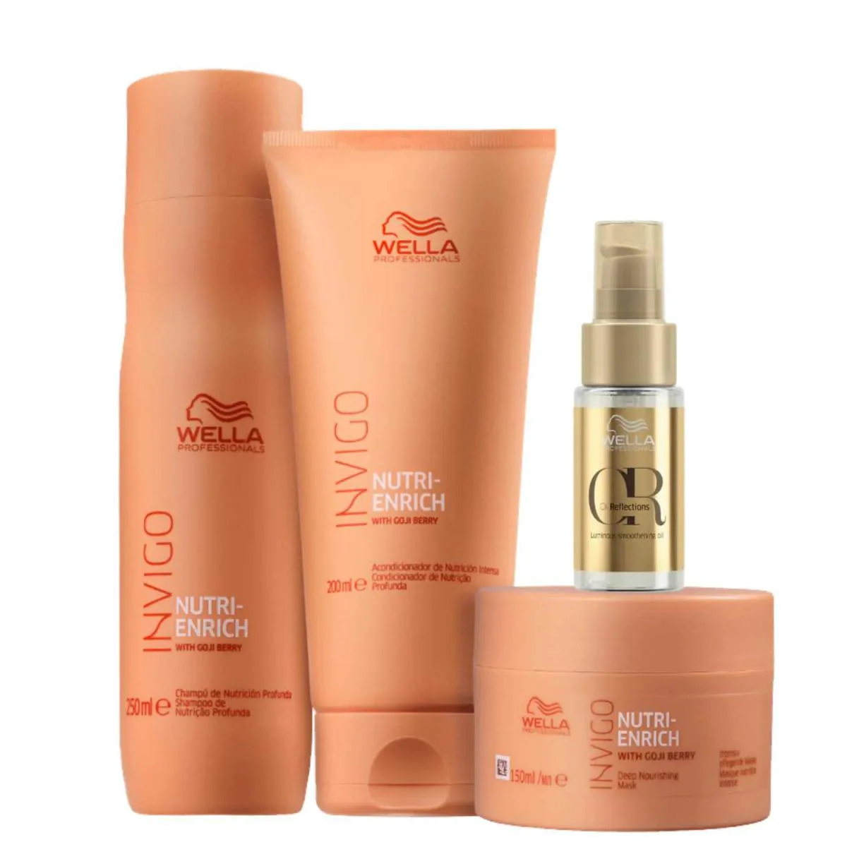 É um conjunto de produtos capilares profissionais da linha Wella Professionals Invigo Nutri-Enrich, composto por shampoo, condicionador, máscara e óleo capilar, desenvolvido especialmente para cuidar de cabelos secos, ressecados ou quimicamente tratados, oferecendo nutrição, hidratação, brilho e maciez aos fios.