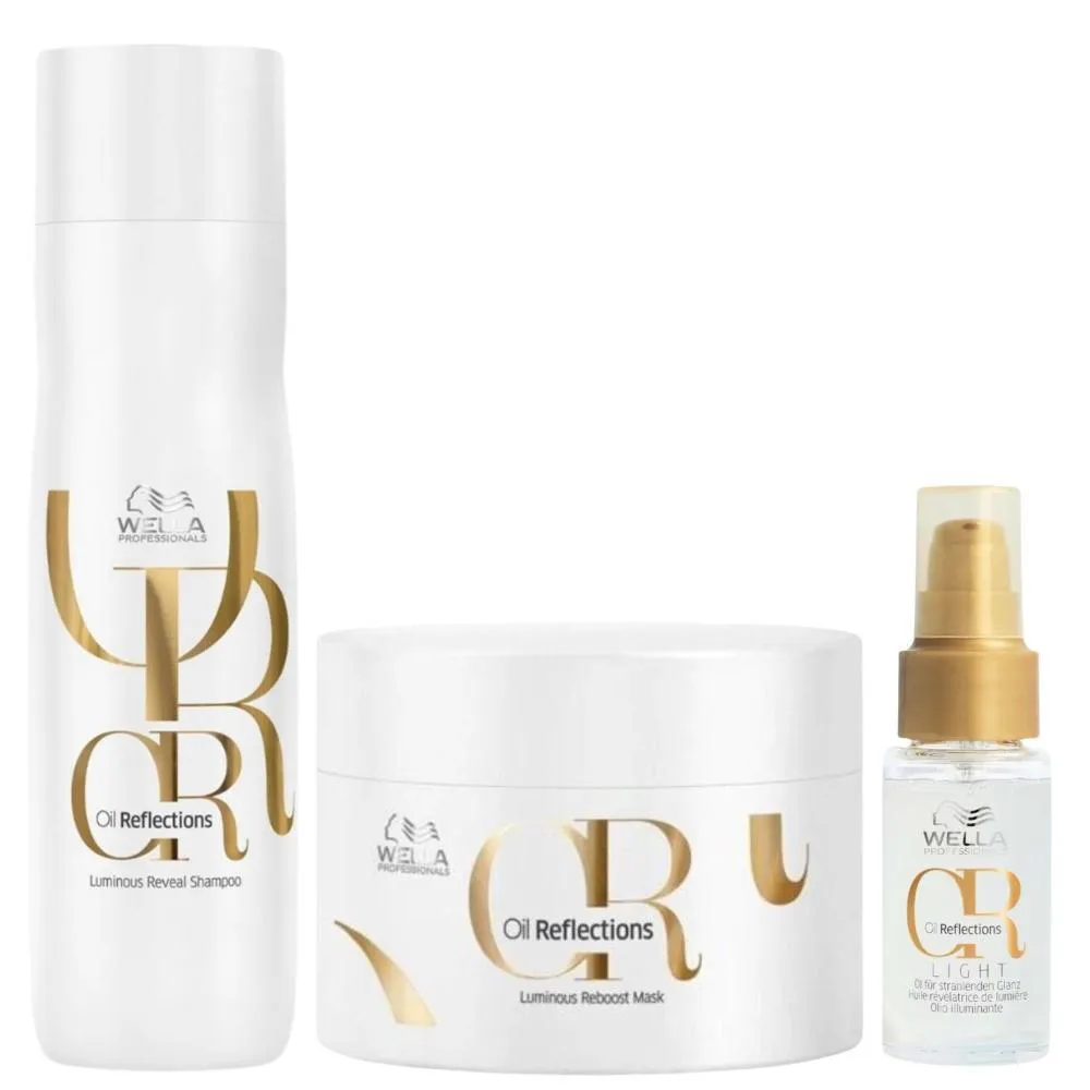 O kit Wella Oil Reflections é um conjunto de três produtos capilares complementares compostos por shampoo, máscara e óleo light, desenvolvido para tratamento capilar com foco em brilho, nutrição e maciez.