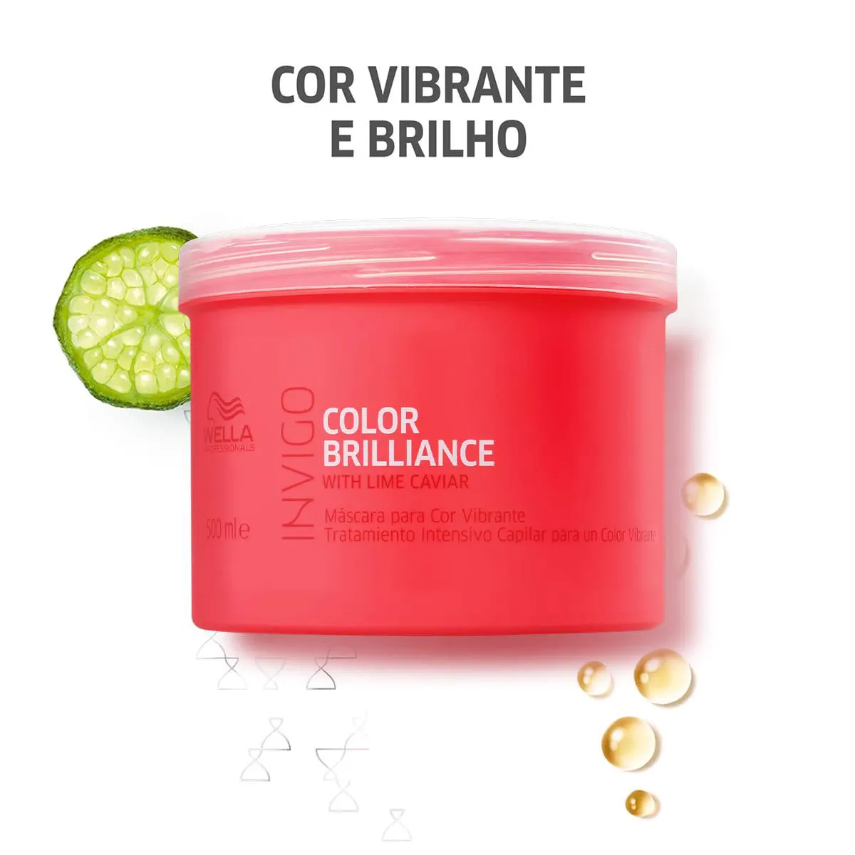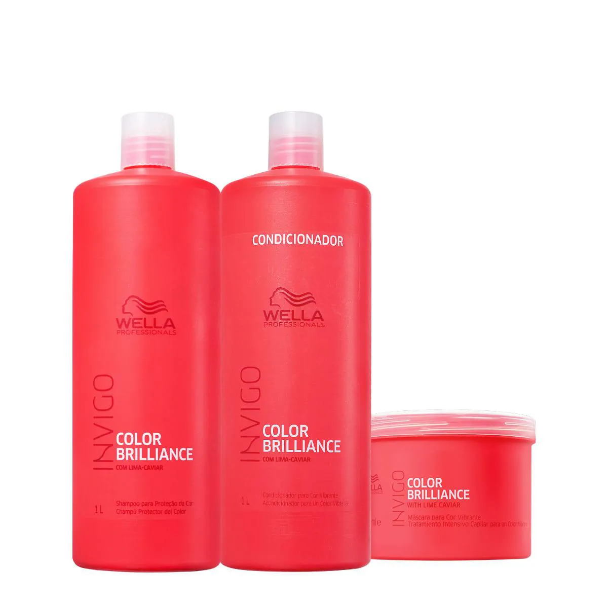 Este Kit Contém Wella Professionals Invigo Color Brilliance - shampoo 1L: limpa os fios de forma otimizada para proteger do desbotamento. Preserva a cor vibrante por até 7 semanas. Wella Professionals Invigo Color Brilliance - condicionador 1L: desembaraça os fios e mantém a cor linda e vibrante por mais tempo. Com proteção da cor por até 7 semanas. Wella Professionals Invigo Color Brilliance - máscara Capilar 500ml: proporciona proteção da cor por até 7 semanas. Sua fórmula é rica em vitaminas que nutrem o cabelo, resultando em fios saudáveis, protegidos do desbotamento e com a cor linda.Conselho de Aplicação