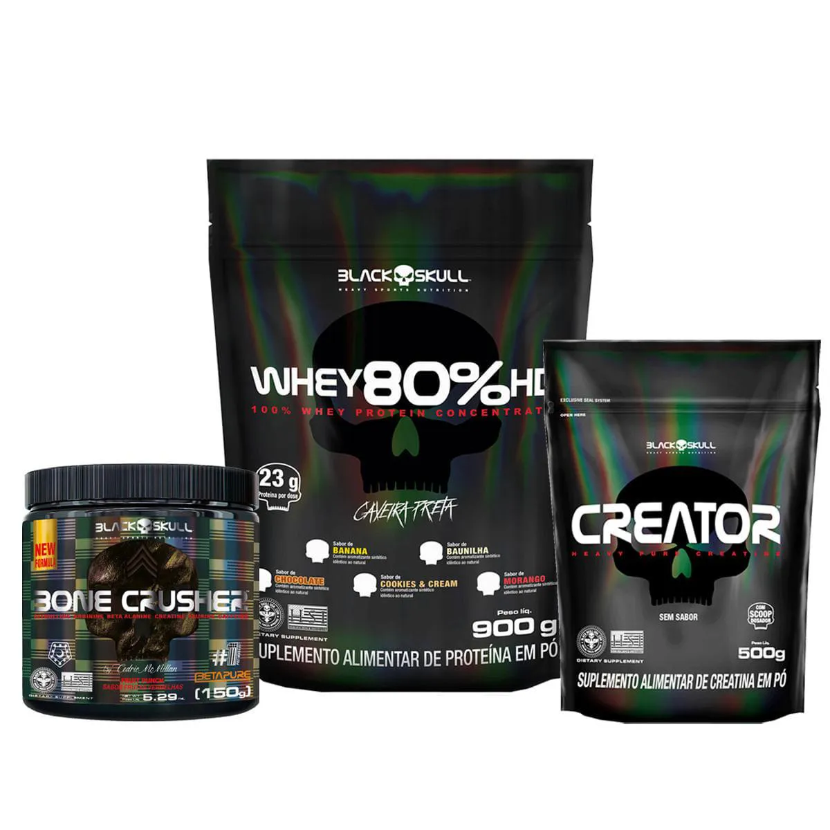 Kit Whey 80% Hd + Creator 500G + Pré-Treino Bone Crusher Fruit Punch 150G - Black Skull NA NA Cookies