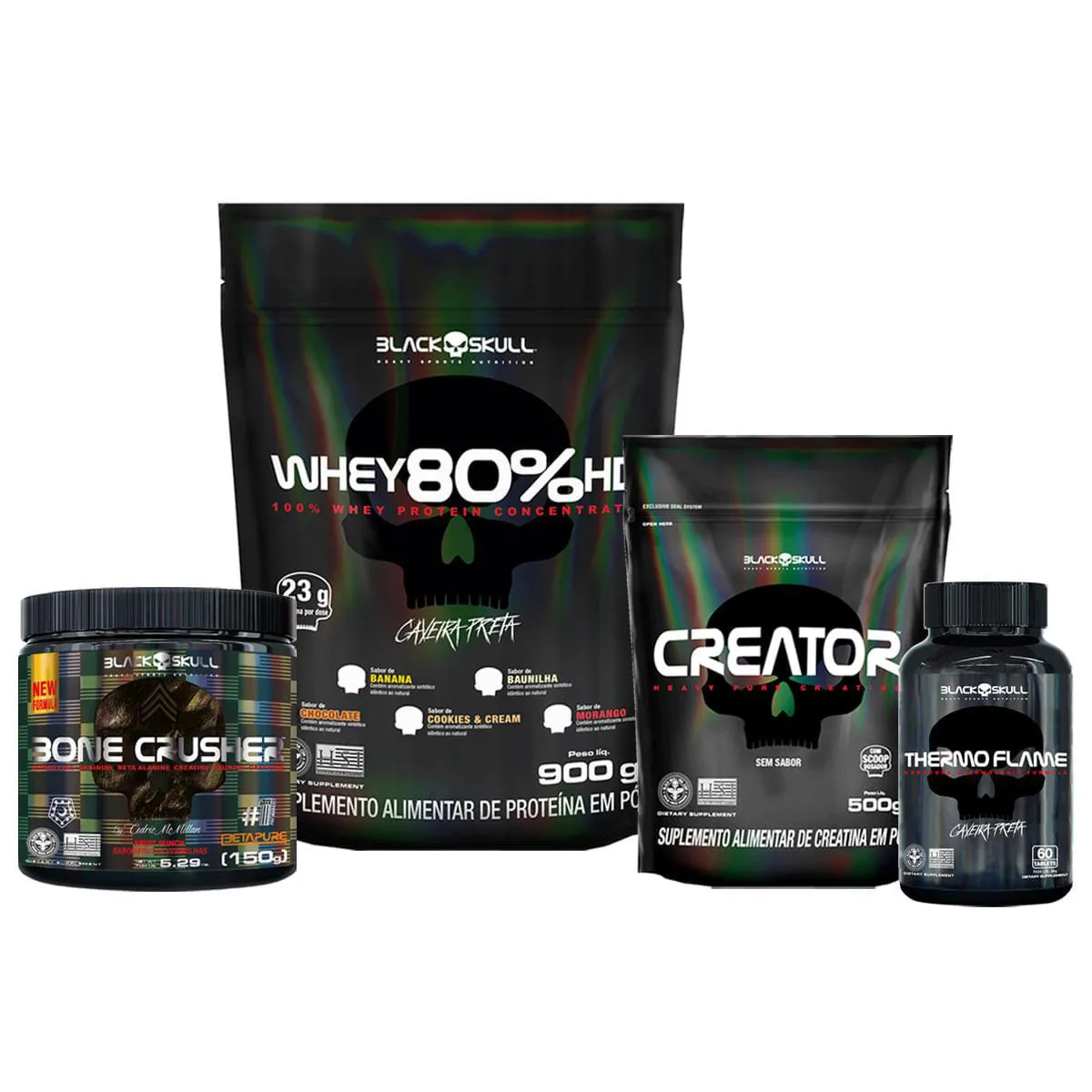 O que é e para que serve o Kit Whey 80% Hd + Creator 500G + Thermo Flame 60 Tabs + Pré-Treino Bone Crusher Fruit Punch 150G - Black Skull Na Na chocolate?