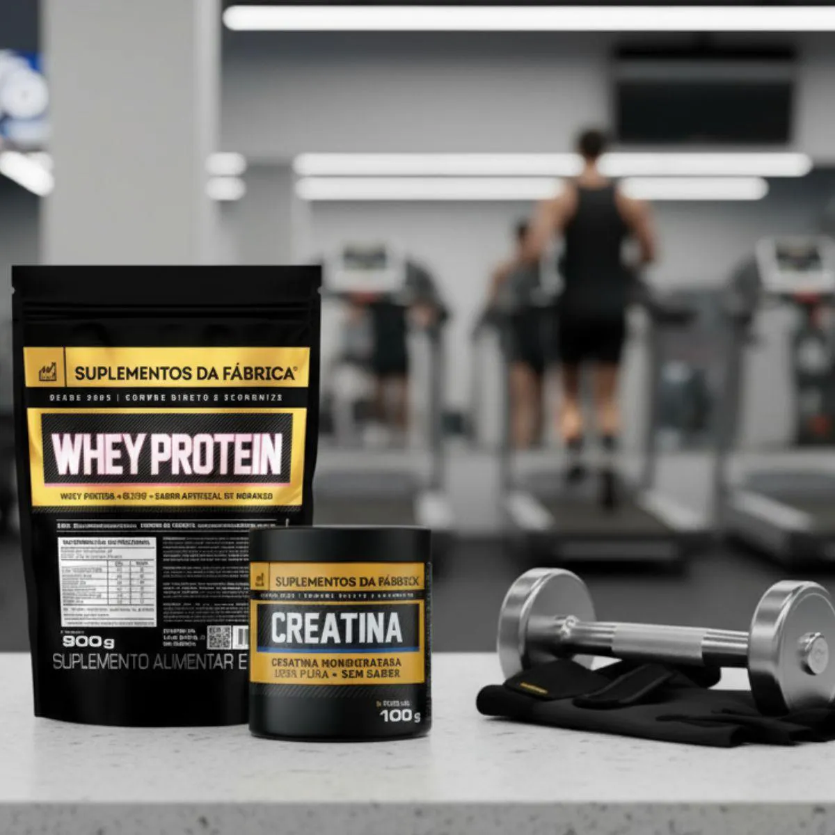 O kit é um conjunto de suplementos nutricionais composto por um whey proteico e duas unidades de creatina monohidratada, desenvolvido para oferecer praticidade, qualidade nutricional e economia no consumo de suplementos.