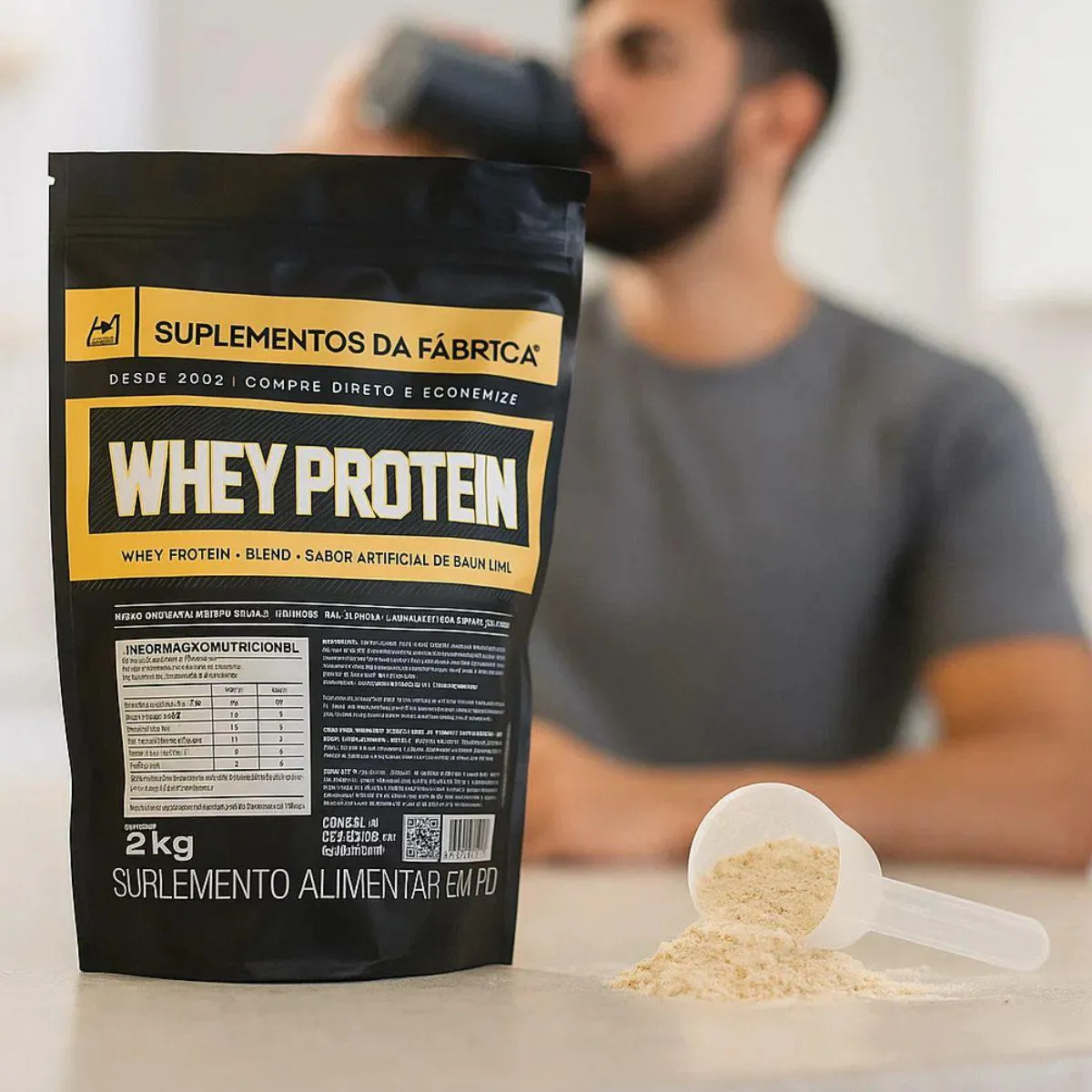 - Adicione a dose de whey na bebida escolhida.