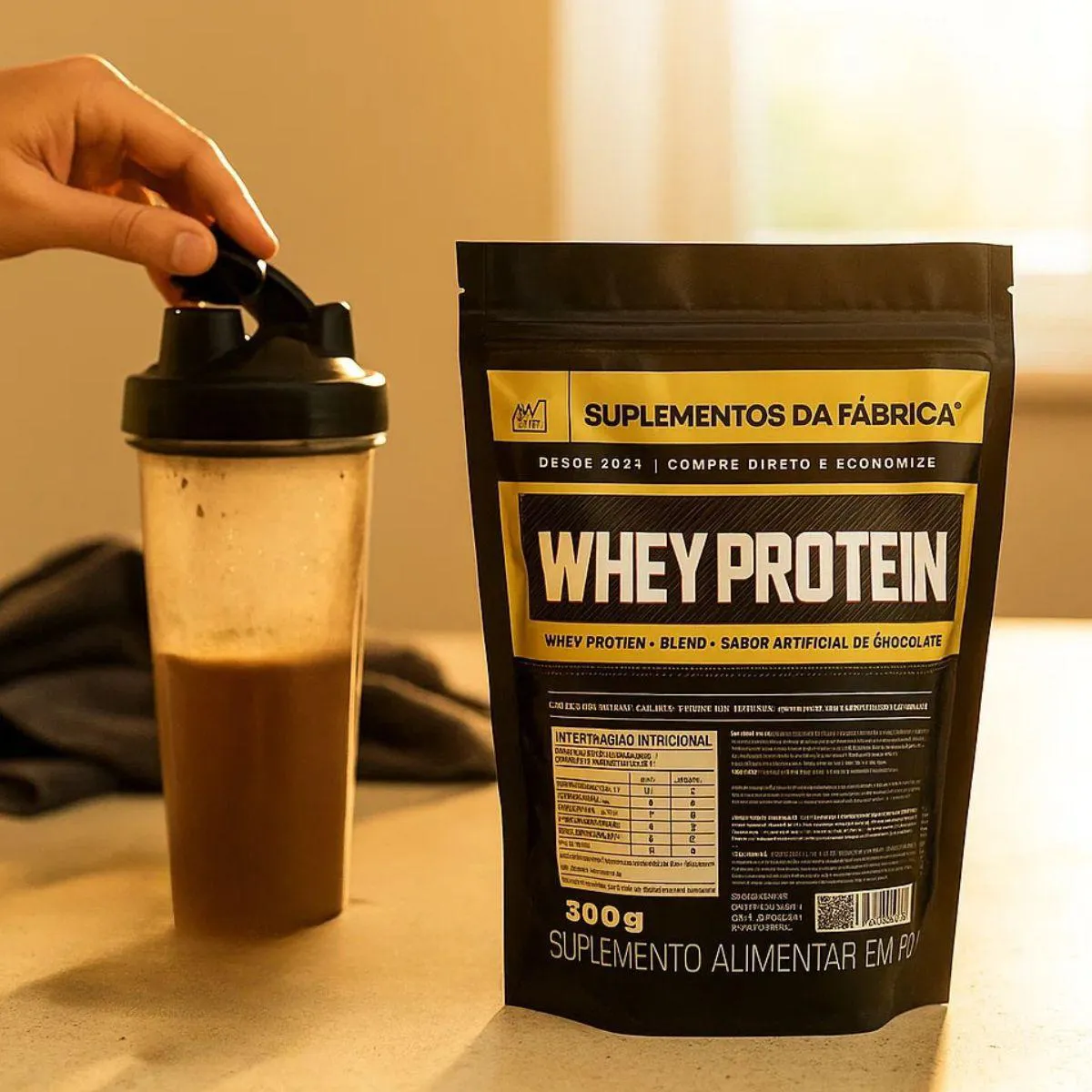 - Misture bem o pó até completa dissolução, usando um shaker ou liquidificador.