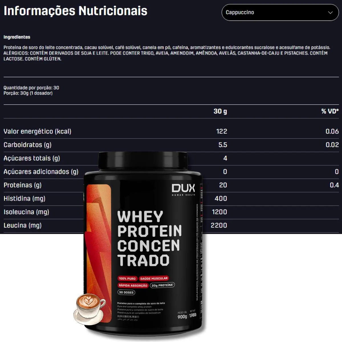 - Whey Concentrado de alto rendimento e custo-benefício com sabor cappuccino
