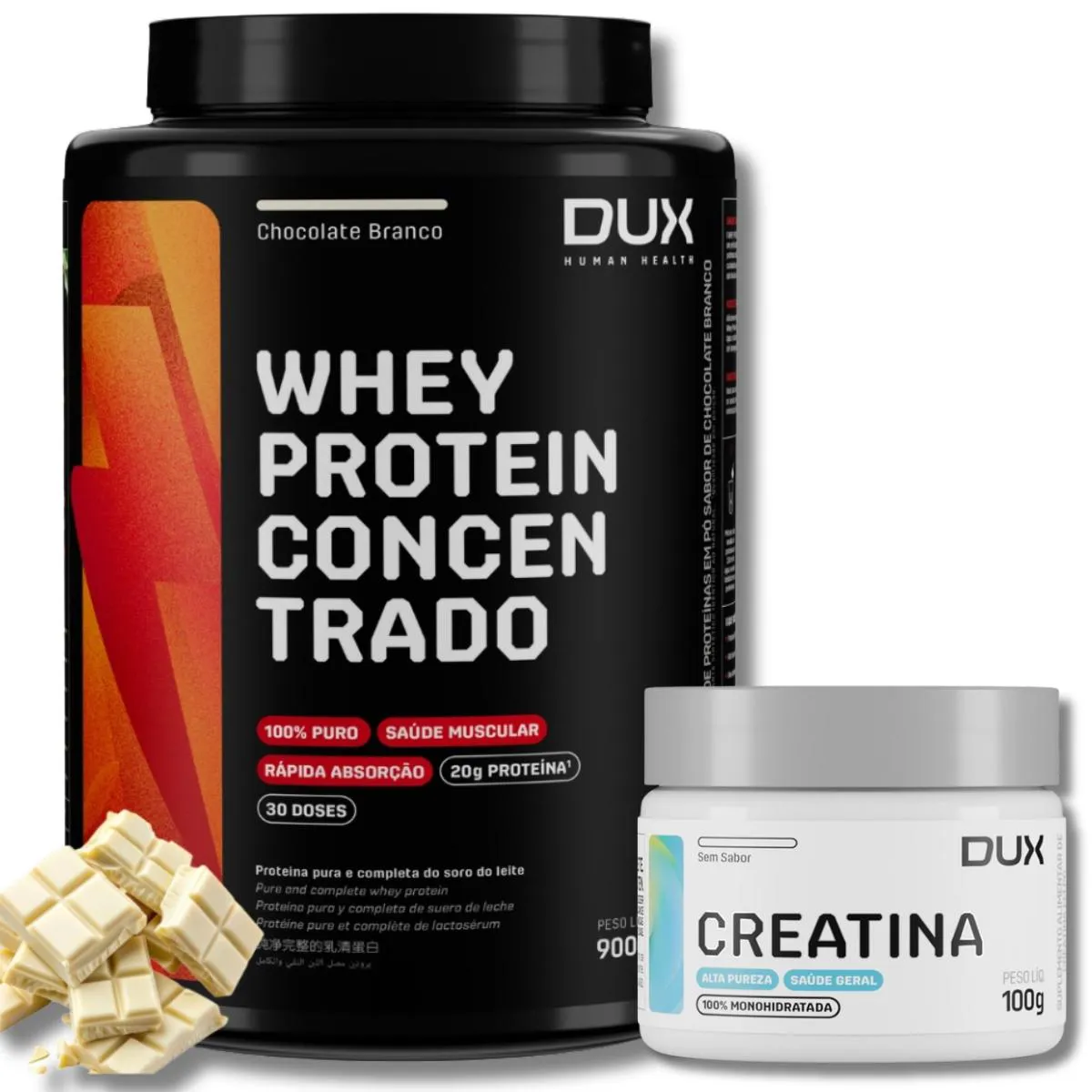 Kit whey protein Concentrado 900g chocolate Branco (sabor whey) + creatina 100g Sem Sabor — Dux Human Health
