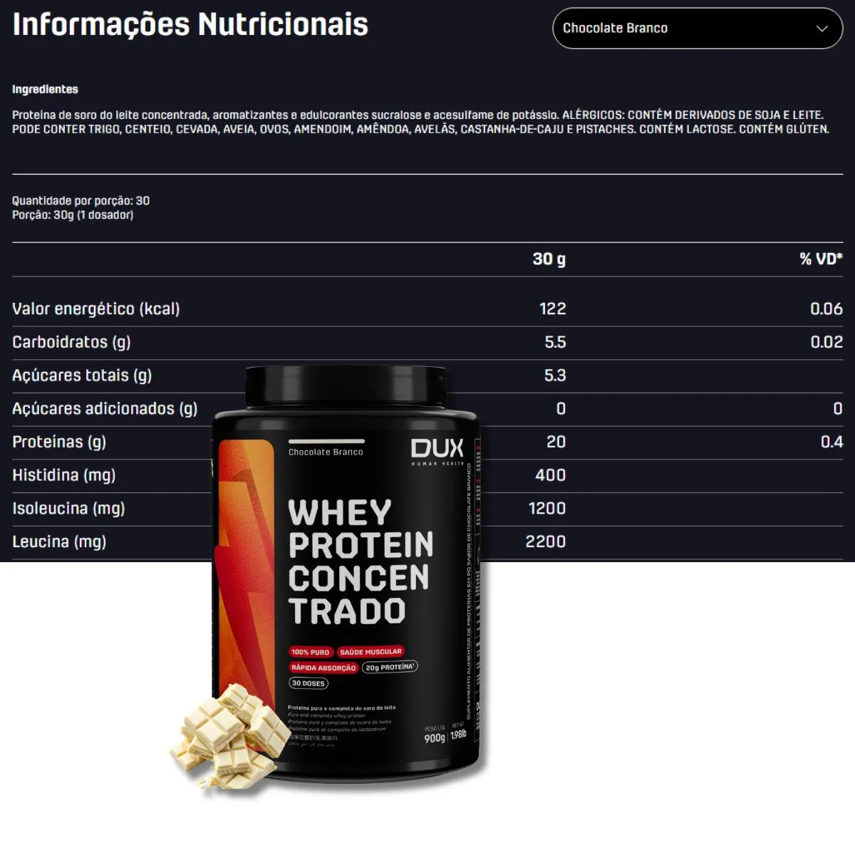 - Whey com sabor chocolate branco cremoso.