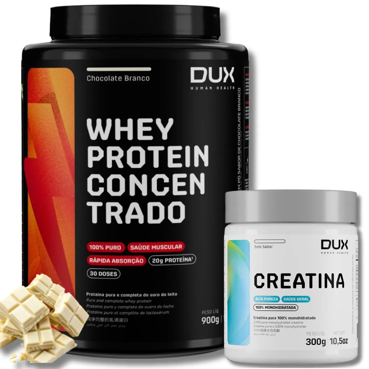 Kit Whey Protein Concentrado 900g Chocolate Branco (sabor whey) + Creatina 300g Sem Sabor — Dux Human Health