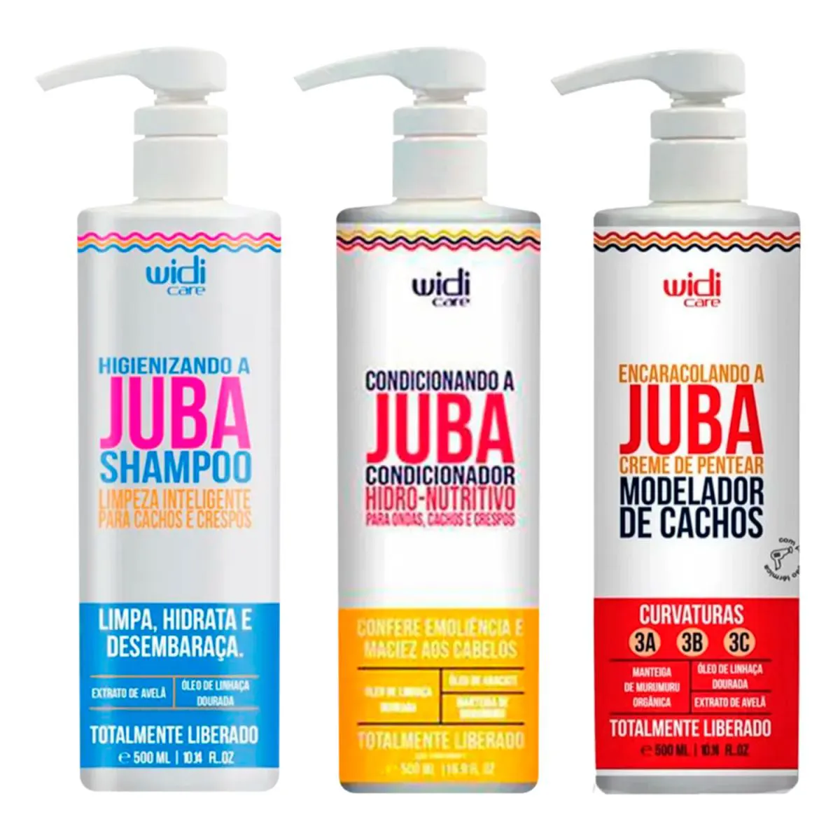 Kit Juba Widi Care: Cabelos cacheados e crespos definidos, hidratados e macios. Shampoo Higienizando a Juba, Condicionador Hidro-Nutritivo Condicionando a Juba e Encaracolando a Juba. Perfeito para quem busca definição e cuidado para os cachos.