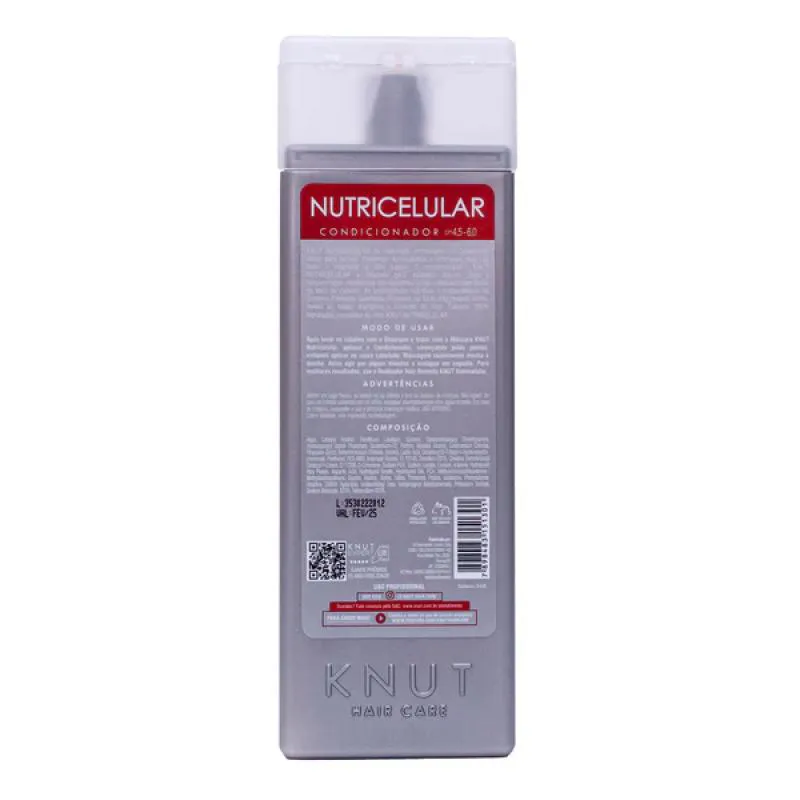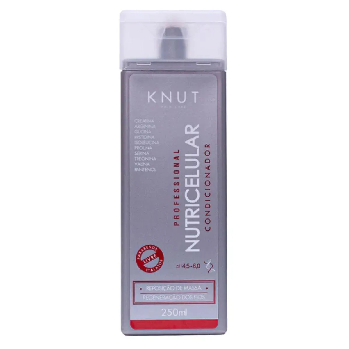 KNUT NUTRICELULAR condicionador 250ML KNUT NUTRICELULAR combina 10 ativos poderosos, entre proteínas, aminoácidos e vitaminas que nutrem a fibra capilar, regeneram as células e com sua textura cremosa penetram profundamente, hidratando e tratando os fios de dentro para fora. O Condicionador KNUT NUTRICELULAR é indicado para cuidados diários, a concentração dos ativos equilibrados torna-o delicado para todos os tipos de cabelos. Age revitalizando os cabelos recém lavados promovendo desembarace, maciez e sedosidade. Enriquecido com creatina, aminoácidos e pantenol que promovem o preenchimento dos poros e regenera a fibra capilar com isso mantém os cabelos hidratados, fortes, resistentes e com brilho intenso. Proporcionando leveza ao toque, maciez, disciplina e controle do frizz. Cabelos 100% hidratados e nutridos só com KNUT NUTRICELULAR. Especificações