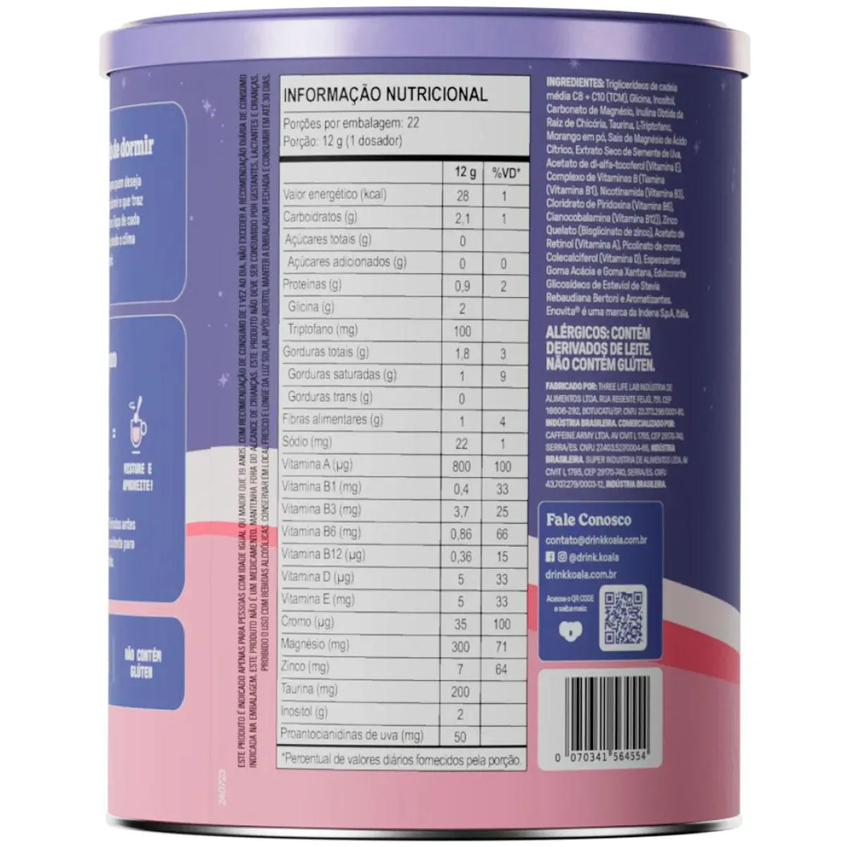 sono de qualidade começa com escolhas inteligentes. Experimente o Koala Sleep, sua bebida noturna com sabor suave que vai transformar seu ritual de descanso em um momento de autocuidado e bem-estar. Com uma fórmula avançada, livre de açúcares, glúten, corantes e adoçantes artificiais, Koala Sleep combina vitaminas essenciais como A, D, E e complexo B — nutrientes que ajudam na produção natural de melatonina, melhoram a qualidade do sono e ainda apoiam a recuperação neuromuscular. Adoçado naturalmente com stevia, é uma opção leve, funcional e deliciosa para quem busca relaxar, desacelerar e acordar com mais disposição. Mais do que dormir bem. É cuidar do corpo, da mente e do amanhã. Adicione Koala Sleep à sua rotina e sinta a diferença noite após noite. A inclusão de alimentos na dieta diária e, para apoiar, a suplementação em casos onde a ingestão dietética possa ser insuficiente deve ser feita sempre com a orientação de um profissional de saúde. Advertências: "ESTE PRODUTO NÃO É UM MEDICAMENTO" "ESTE PRODUTO É UM SUPLEMENTO ALIMENTAR" "MANTENHA FORA DO ALCANCE DE CRIANÇAS" "NÃO EXCEDER A RECOMENDAÇÃO DIÁRIA DE CONSUMO INDICADA NA EMBALAGEM" Registro no M.S. nº Produto dispensado de registro RDC 240 de 2018