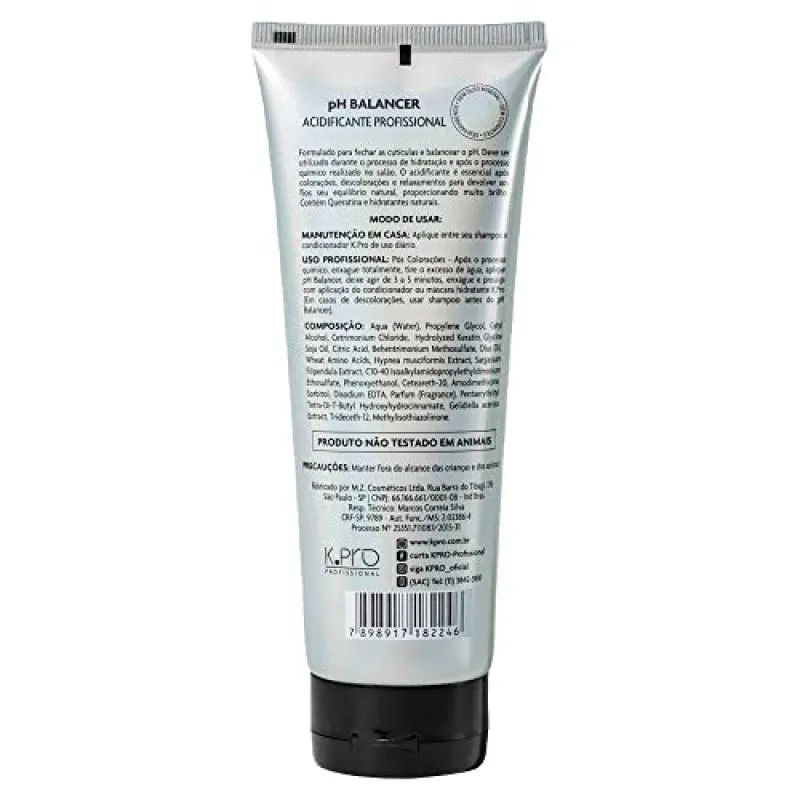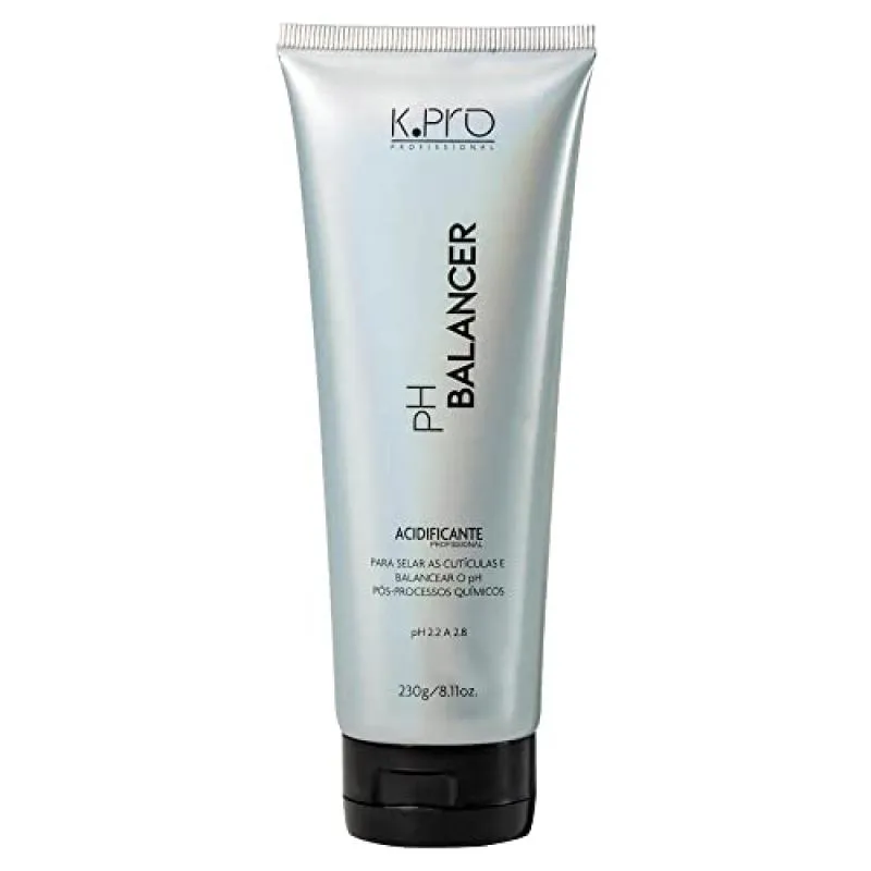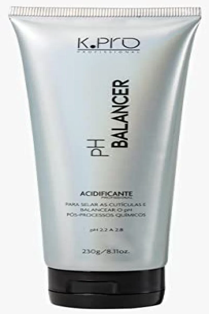 K.Pro pH Balancer 230g Acidificante para equilibrar o pH (restaurar e proteger a camada ácida natural) do cabelo, ajudar no alinhamento e selamento das cutículas, controla as cargas eletricas da superfície dos fios, elimina possíveis resíduos de outras químicas para evitar coceiras e alergias na pele. K.Pro pH Balancer deve ser utilizado durante o processo de hidratação e apos o processo químico realizado no salão. e essencial apos colorações, descolorações e relaxamentos para devolver aos fios seu equilíbrio natural, proporcionando muito brilho. Contem Queratina e hidratantes naturais. Quando usado antes das máscaras e condicionadores, pode potencializar seus efeitos. Usado tambem para complementar os tratamentos semanais de todos os tipos de cabelo, principalmente cabelos processados com químicas em geral. A acidificação periodica traz inúmeros benefícios, fios mais comportados, fáceis para desembaraçar, selados, protegidos, com mais brilho, sedosidade e leveza. Resultado: Cabelos reequilibrados, suaves e brilhantes. Modo de usar: Na hidratação, apos lavar os cabelos tire o excesso da umidade e aplique o K.Pro pH Balancer mecha a mecha, massageie e penteie, deixe agir por 3 minutos e enxague. Prossiga com o tratamento. Como pos-químico: Finalize seu processo químico, enxague totalmente, tire o excesso da umidade e aplique o K.Pro pH Balancer, deixe agir por 3 minutos e enxague, prossiga com o tratamento. DÚVIDAS FREQUENTES: 1 - O produto e original? Olá, Sim trabalhamos apenas com produtos originais e enviados com nota fiscal. 2 - Qual o prazo para envio? Olá, todos os pedidos aprovados ate as 14:00hs o envio e imediato apos a aprovação do pedido. 3 - Posso fazer retirada do produto? Olá, trabalhamos apenas com envio para sua maior comodidade.