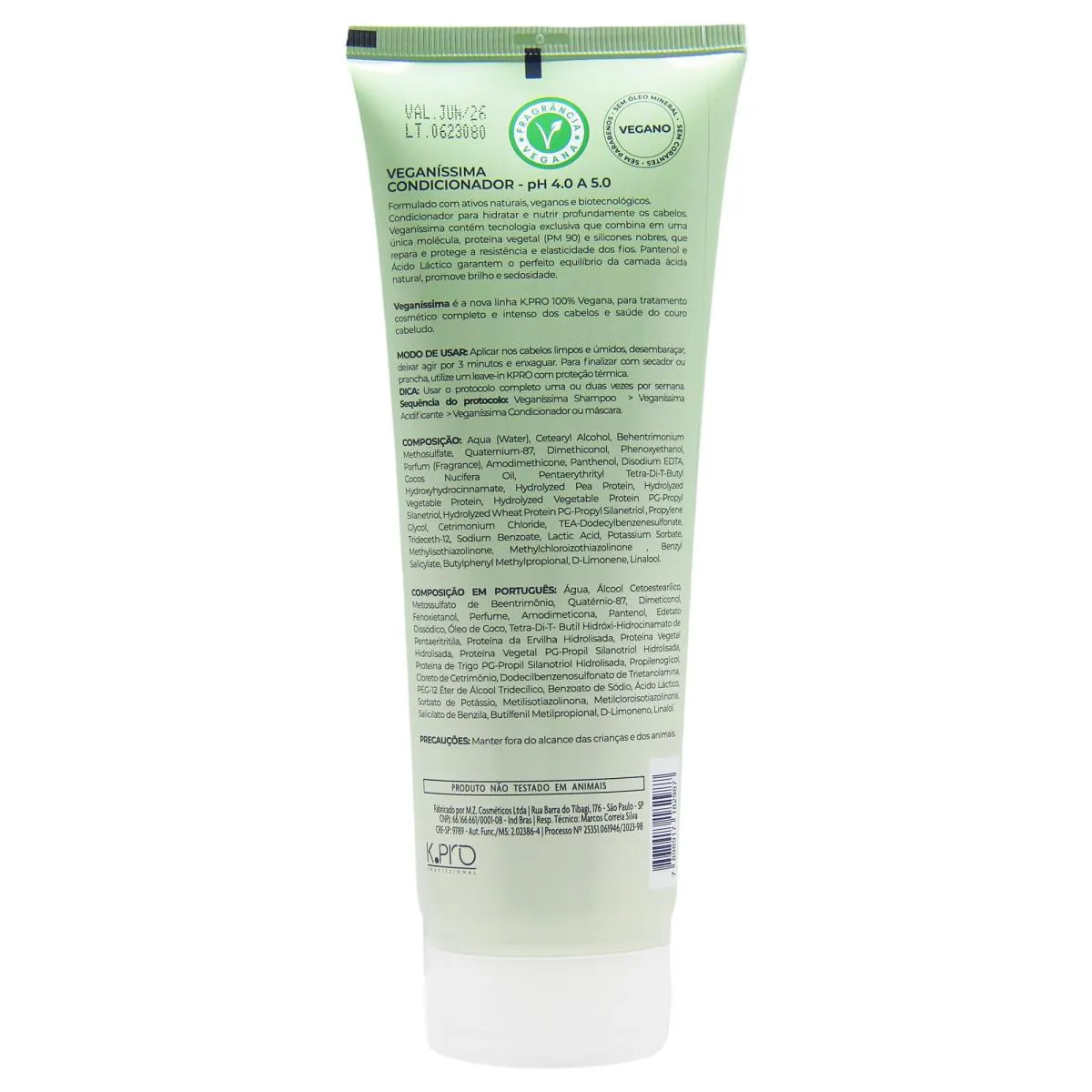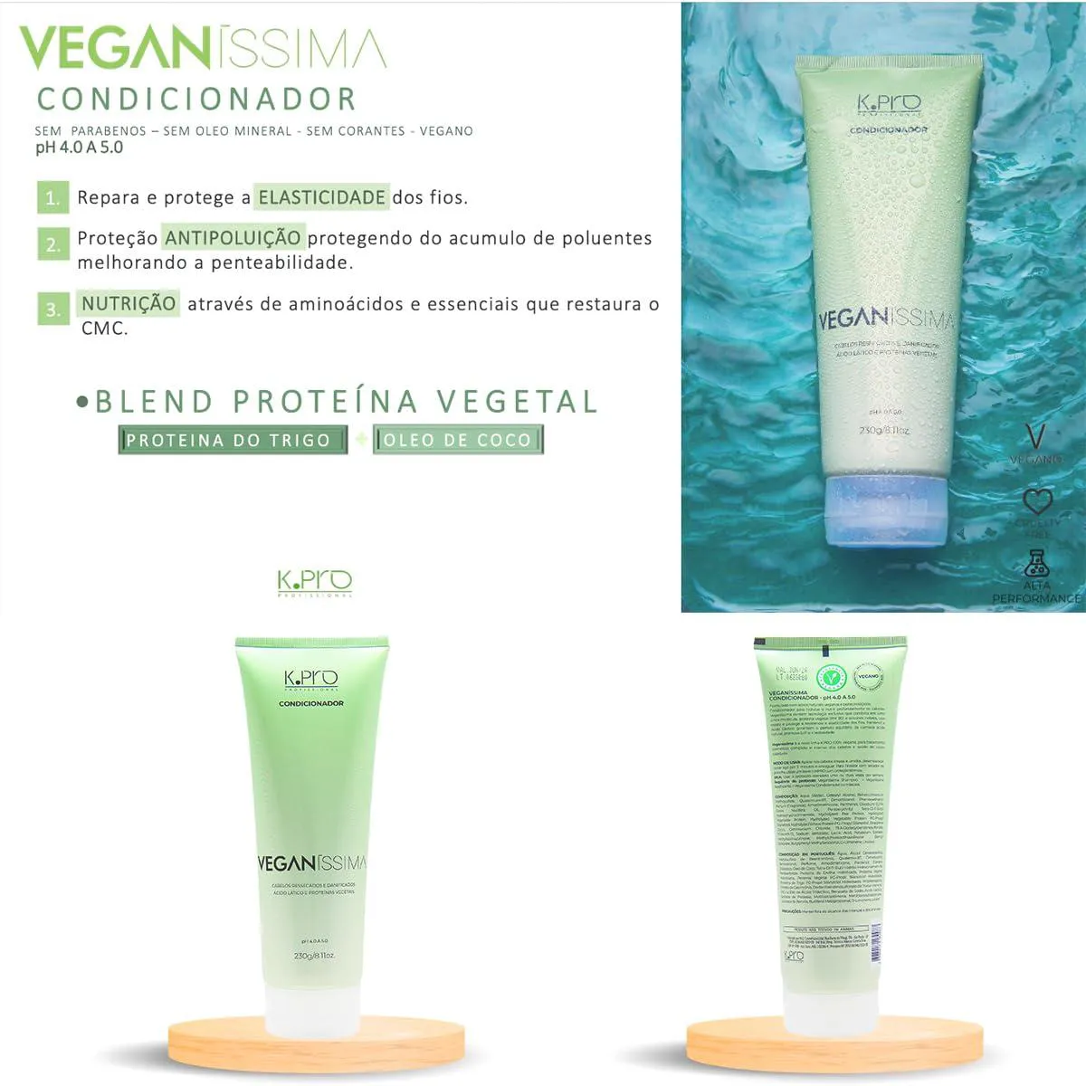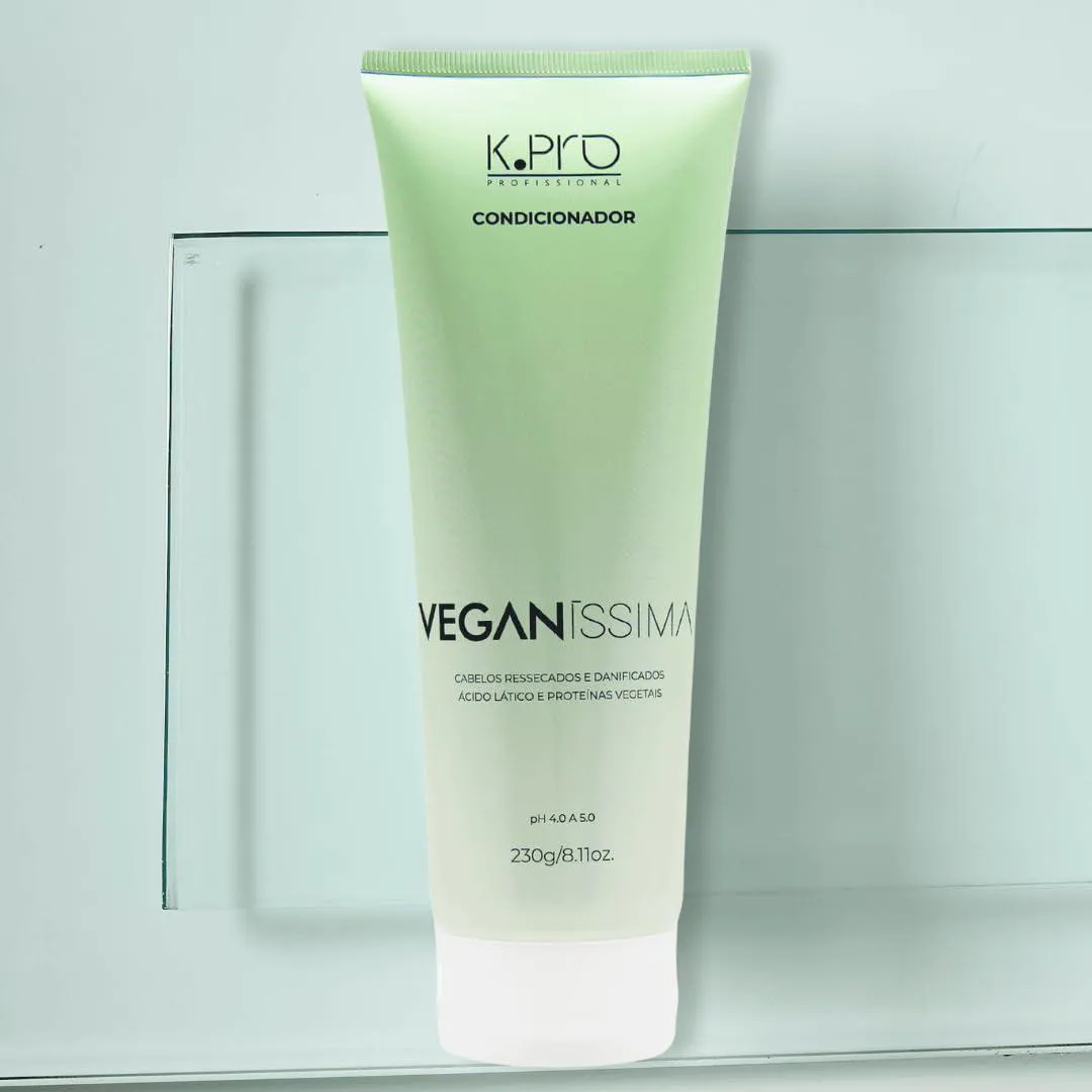 O condicionador K.Pro Veganíssima 230g é um tratamento diário formulado com ingredientes de origem vegetal e alta tecnologia cosmética, ideal para proporcionar hidratação profunda, maciez e desembaraço aos fios sem comprometer a leveza e o movimento natural dos cabelos. Desenvolvido dentro dos princípios da cosmética vegana, este produto oferece cuidados intensivos com respeito à vida animal e ao meio ambiente. Indicado para todos os tipos de cabelo — especialmente os ressecados, danificados ou sensibilizados por processos químicos — o condicionador atua selando as cutículas, preservando a hidratação interna e restaurando a vitalidade dos fios. Sua fórmula é livre de parabenos, silicones insolúveis, sal, corantes artificiais e ingredientes de origem animal, sendo também cruelty-free.