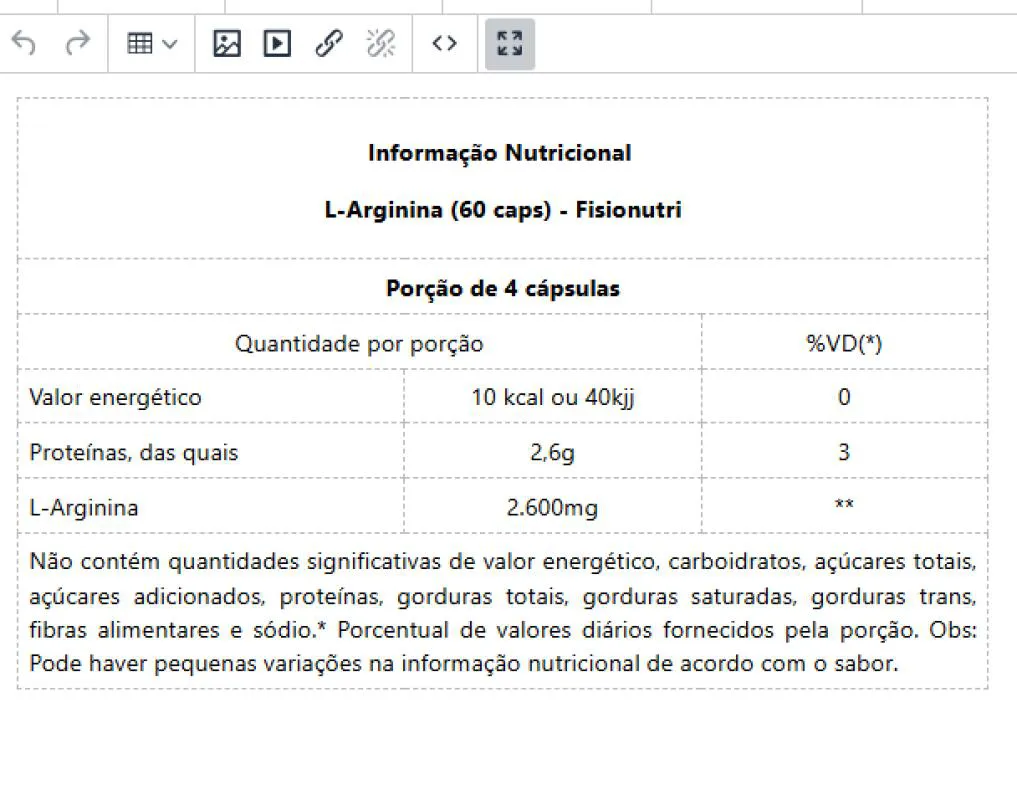 L-Arginina (60 caps) Descubra o poder da L-Arginina 100% Pura da Fisionutri! Potencialize seus treinos, reduza a fadiga, e fortaleça sua imunidade. Um suplemento puro e eficaz que transformará sua performance. Escolha a excelência. Escolha Fisionutri. O que faz a L-Arginina 100% Pura da Fisionutri ser diferente de outros suplementos de arginina no mercado? A L-Arginina 100% Pura da Fisionutri se destaca por sua pureza e eficácia. Enquanto muitos suplementos contêm misturas ou ingredientes adicionais, nosso produto oferece uma dose pura e concentrada de L-Arginina, maximizando a absorção e os benefícios. Escolher Fisionutri é optar pela qualidade, confiança e resultados comprovados em performance e saúde. Como a L-Arginina 100% Pura da Fisionutri pode ajudar na diminuição da fadiga durante os treinos? A L-Arginina é crucial para a produção de óxido nítrico, que melhora a circulação sanguínea e o fluxo de oxigênio para os músculos. Isso retarda a fadiga muscular, permitindo treinos mais longos e produtivos. Nosso suplemento L-Arginina 100% Pura ajuda os atletas a maximizar seus resultados e rendimento. De que forma a suplementação com L-Arginina 100% Pura influencia na liberação do GH? A L-Arginina 100% Pura da Fisionutri pode estimular a liberação do Hormônio do Crescimento (GH), essencial para a recuperação muscular e crescimento. Isso resulta em melhor recuperação, ganho muscular, queima de gordura e melhoria da composição corporal. Como a função vasodilatadora do óxido nítrico, proveniente da L-Arginina, beneficia o rendimento esportivo? A L-Arginina 100% Pura da Fisionutri aumenta a vasodilatação, permitindo que mais oxigênio e nutrientes alcancem os músculos. Isso resulta em maior resistência, menor tempo de recuperação e rendimento esportivo otimizado, essencial para atingir o pico de performance. De que maneira a L-Arginina 100% Pura da Fisionutri auxilia na resposta imunológica do corpo? A L-Arginina ajuda na produção de células imunológicas e na defesa contra patógenos. Ao suplementar com a L-Arginina 100% Pura da Fisionutri, é possível fortalecer o sistema imunológico, tornando o corpo mais resistente a doenças e infecções, tanto no dia a dia quanto no ambiente esportivo. Benefícios: - Pureza e Eficácia Superior;- Redução da Fadiga Muscular;- Aumento da Liberação de GH;- Melhoria do Rendimento Esportivo;- Fortalecimento do Sistema Imunológico.