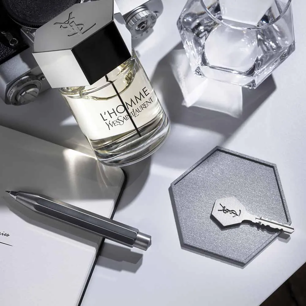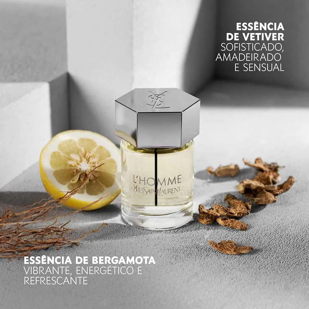 L'Homme de Yves Saint Laurent foi feito para um homem universal, a encarnação de todos os atributos masculinos e todos os aspectos da virilidade. Como um homem distinto, feito de carisma e encanto, contrastes e audácia. Inspirado pelo Bauhaus, o design do frasco de L'Homme expressa um encontro de dois universos. A interpretação de luxo de um objeto diário, e o rústico, interpretado pela pesada tampa de aço. As inesperadas notas florais fazem uma união cativante.