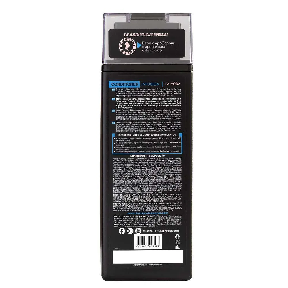 Tratamento De Reparação. Após o uso do shampoo, retire o excesso de água dos fios e distribua o condicionador no comprimento e pontas. Massageie, desembarace, deixe agir por 2 minutos e enxágue.Para potencializar a hidratação, o Condicionador Infusion LA MODA VEGAN promove uma restauração profunda dos fios, garantindo resistência, reconstrução e selamento protetor. Ele ainda facilita o desembaraço e proporciona brilho intenso e duradouro. Adeus, pontas duplas e frizz!