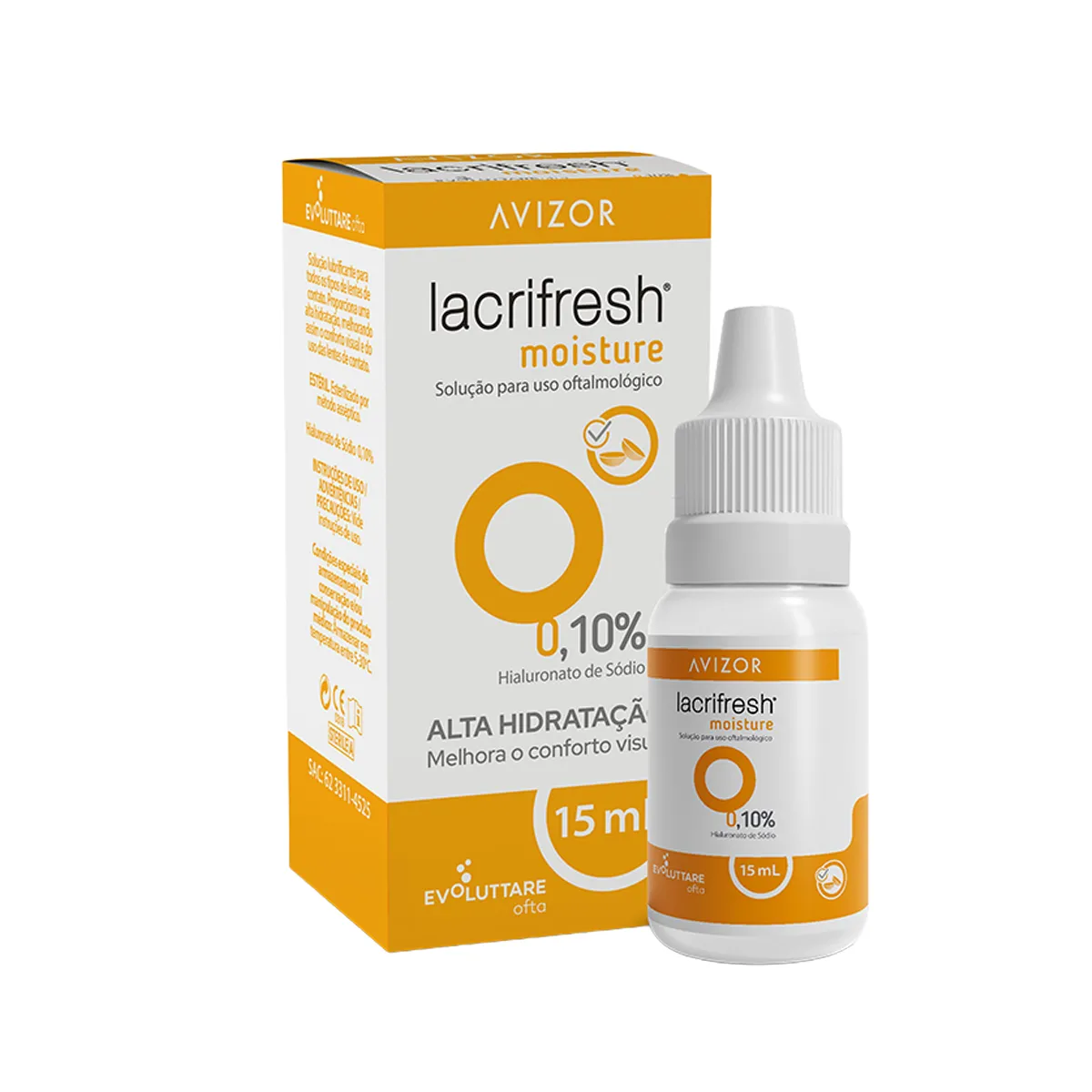 O AV Lacrifresh Moisture 0,10% é uma solução oftálmica lubrificante e hidratante desenvolvida para aliviar os sintomas de secura ocular leve, irritação e cansaço visual. Sua fórmula contém 0,10% de hialuronato de sódio, proporcionando hidratação eficaz, lubrificação e conforto prolongado. É indicada para pessoas expostas a condições ambientais adversas, uso prolongado de dispositivos digitais ou fadiga ocular. Também melhora o conforto visual durante o uso de lentes de contato.