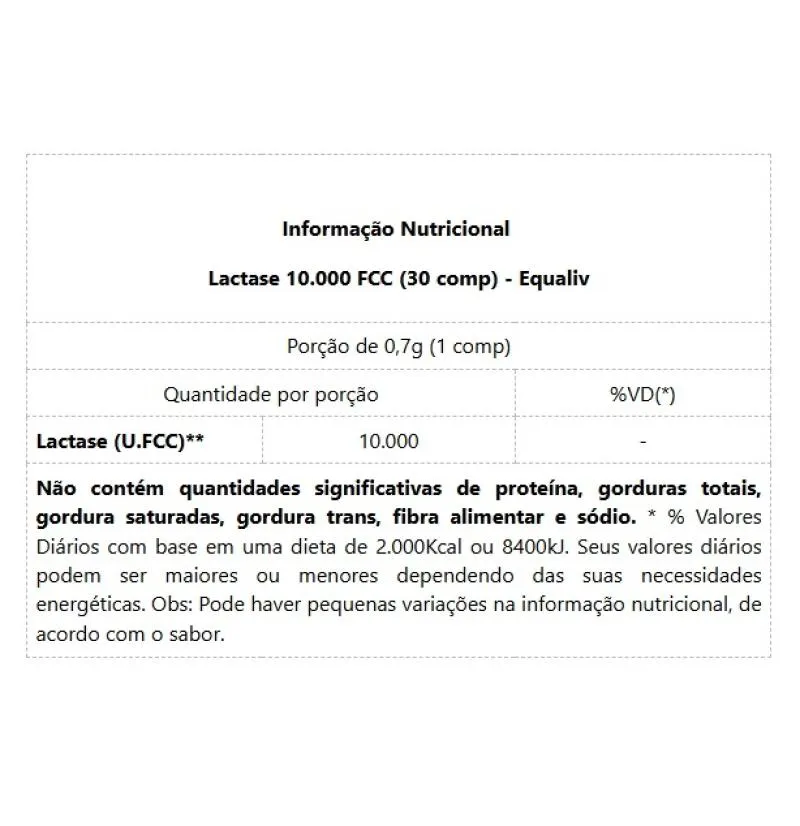 Lactase 10.000 FCC (30 comp) Equaliv Lactase (Aspergillus oryzae) é um suplemento alimentar em comprimidos mastigáveis que oferece 10.000 U.FCC (Unidade de atividade enzimática determinada segundo o Food Chemical Codex), sabor creme. Estudos mostram que a Intolerância à Lactose (IL) é uma síndrome a qual a pessoa apresenta sintomas de mal estar gastrointestinal após o consumo de alimentos que contenham lactose. Lactose é um açúcar presente em grande quantidade no leite, e que deve ser quebrada pela enzima lactase para uma melhor absorção pelo organismo. Caso contrário, situações de dor, distensão abdominal, flatulência, diarreia e vômito após o consumo de leite e laticínios, podem ocorrer. Equaliv Lactase auxilia na quebra da lactose e na promoção do bem-estar para uma alimentação sem grandes restrições. Benefícios: - Zero glúten;- Zero açúcares;- Sabor creme;- Comprimidos mastigáveis;- Auxilia na digestão da lactose;- Proporciona 10.000 U.FCC por porção.