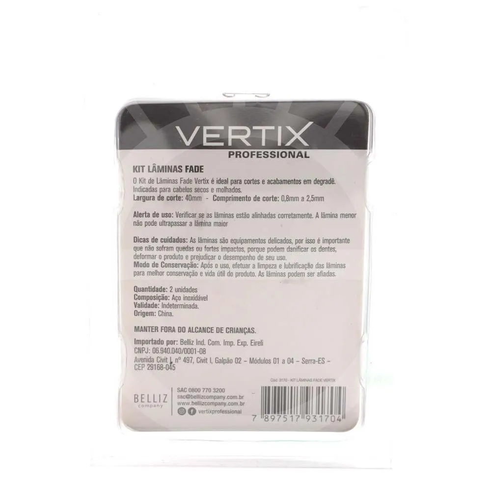 Lâminas Vertix – FadeCaracterísticas: O kit de lâminas é no modelo fade 0,8mm/2,5mm.