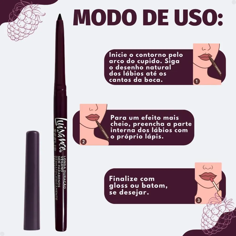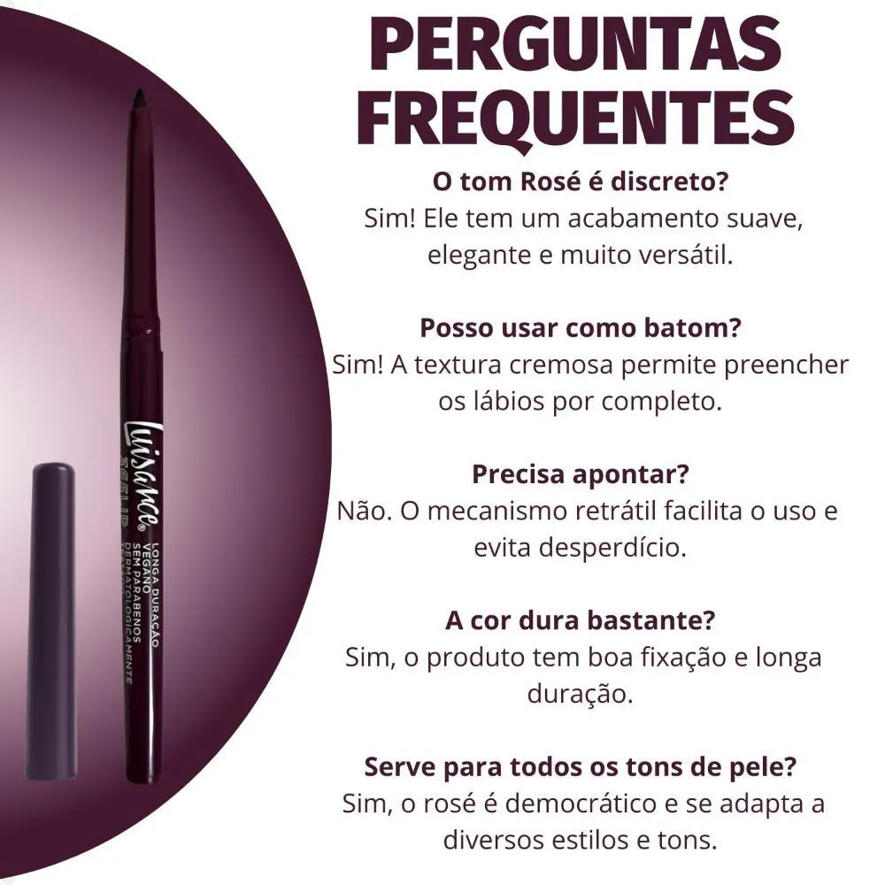 Lápis Labial Retrátil Luisance 365 Lip Rosé 0,24g Realce seus lábios com a intensidade e sofisticação do Lápis Labial Retrátil Luisance 365 Lip Amora. Com seu tom profundo e vibrante de amora, este lápis proporciona uma aplicação cremosa e uniforme, que desliza suavemente para um acabamento perfeito. O mecanismo retrátil facilita o uso, dispensando apontador e permitindo retoques práticos em qualquer lugar. Ideal para contornar e preencher os lábios, ele valoriza o formato natural e garante uma cor intensa e duradoura, perfeita para ocasiões especiais ou para o dia a dia. Complete sua maquiagem com o toque elegante e marcante do Lip Amora. . Benefícios -Textura cremosa e confortável -Mecanismo retrátil prático -Longa duração -Contorno preciso -Compacto e portátil -Cor intensa e vibrante -Versatilidade 2 em 1 . Modo de usar Com os lábios limpos e hidratados, contorne cuidadosamente os lábios, iniciando pelo arco do cupido e seguindo até os cantos da boca, para garantir definição e evitar que o batom escorra. . Perguntas Frequentes O lápis retrátil dispensa o apontador? Sim, o mecanismo retrátil facilita a aplicação e evita desperdícios, sem a necessidade de apontador. Dá para criar diferentes efeitos com o lápis Amora? Sim! Você pode usar para contornar, preencher totalmente ou até criar efeitos de degradê combinando com outros tons. O lápis Lip Amora resseca os lábios? Não! Sua fórmula cremosa ajuda a manter os lábios hidratados e confortáveis. Como faço para conservar melhor o lápis labial? Guarde-o em local fresco e seco, com a tampa bem fechada para manter a textura e a durabilidade. O lápis transfere facilmente? Ele tem boa fixação, mas pode transferir levemente em contato com alimentos e bebidas, por isso retoques são recomendados. . Código de Registro Sanitário (ANVISA) 25351.368476/2022-18