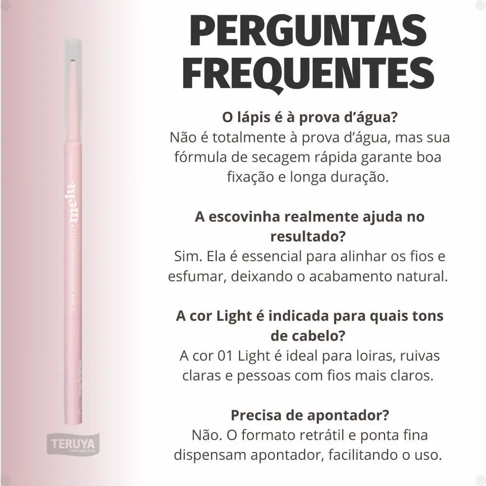 Marca: MELUTipo: LÁPIS DE SOBRANCELHACor: 01 LightTipo de Ponta: FinaAnvisa:25351.396596/2022-05
