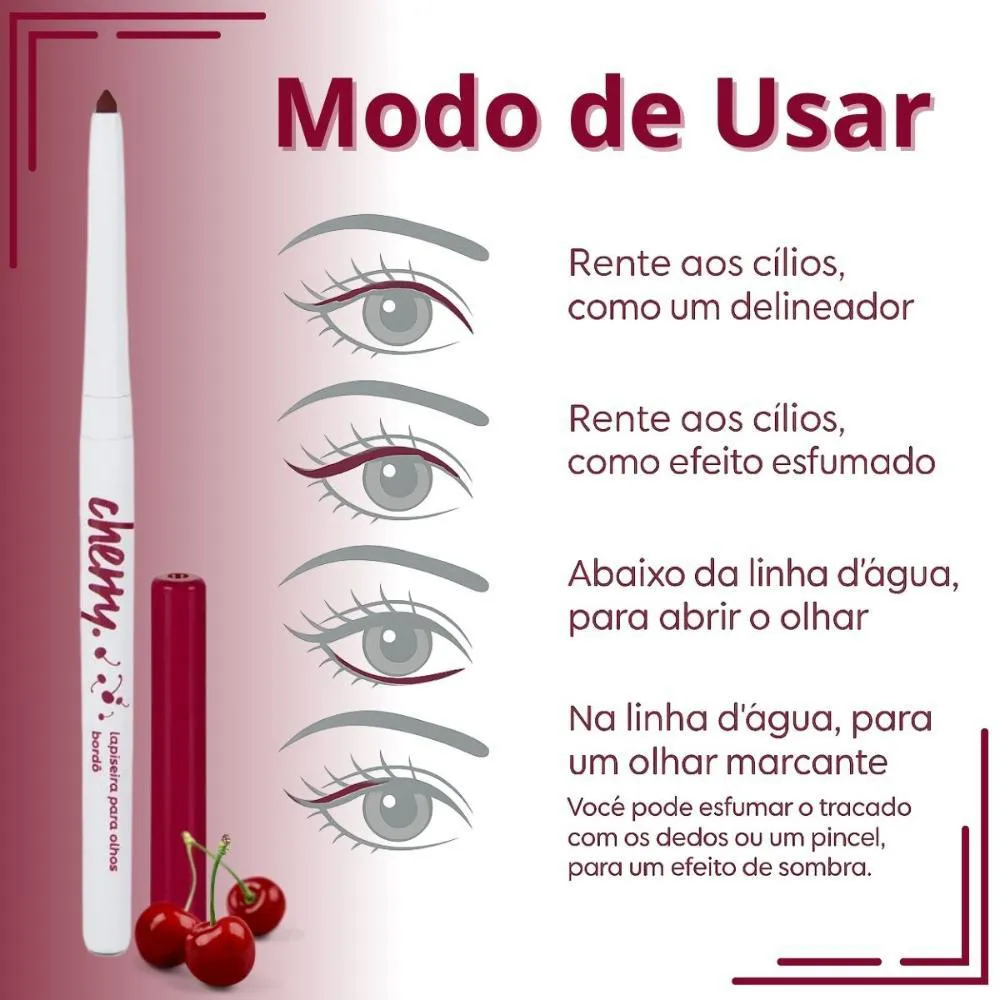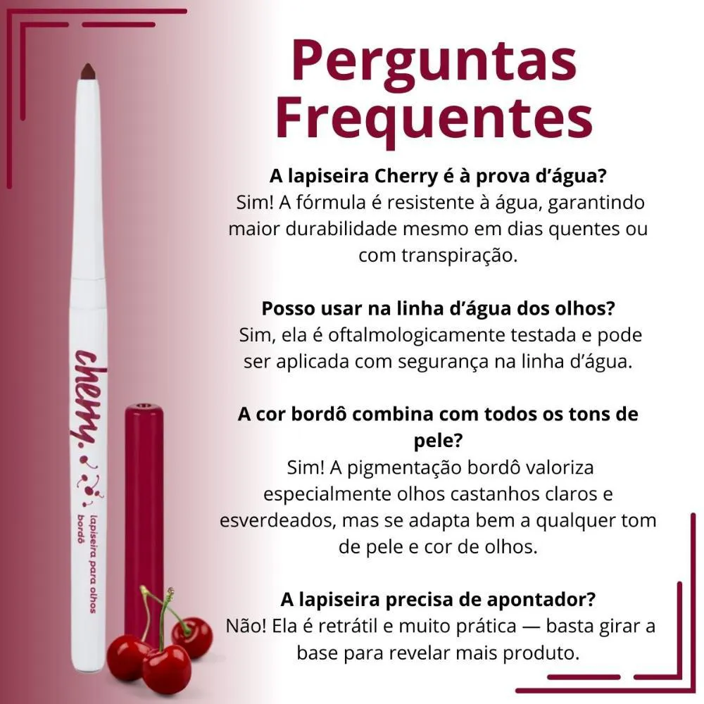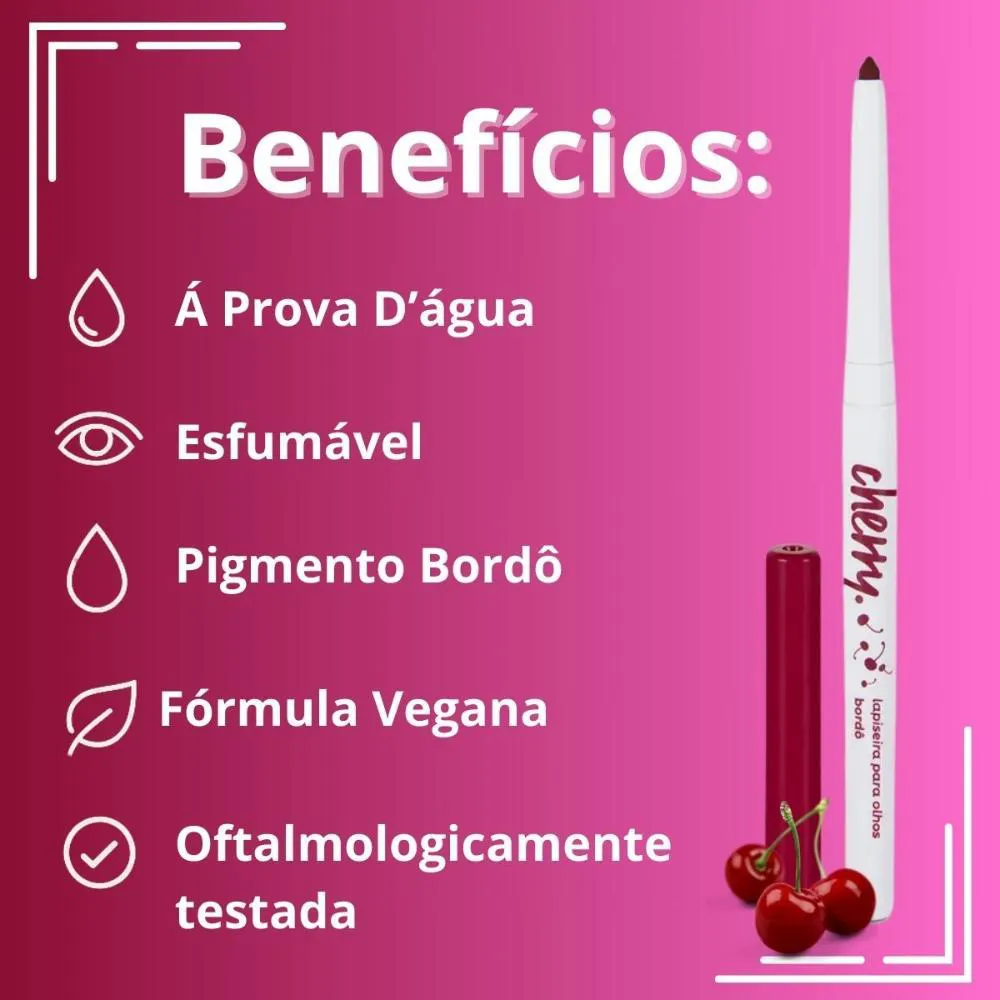 Realce o seu olhar com um toque ousado e sofisticado! A Lapiseira para Olhos Cherry da Vizzela tem coloração bordô intensa que valoriza especialmente olhos castanhos claros e esverdeados, garantindo um visual marcante e moderno. Com textura macia, altamente pigmentada e à prova d’água, ela é ideal para ser aplicada na linha d’água, como delineado rente aos cílios ou até mesmo para criar aquele efeito esfumado poderoso com um pincel pequeno. A embalagem é retrátil, dispensando apontador e oferecendo mais praticidade no dia a dia. Além disso, sua fórmula é vegana, cruelty free, livre de parabenos e oftalmologicamente testada — perfeita para quem ama maquiagem consciente. . BENEFÍCIOS: